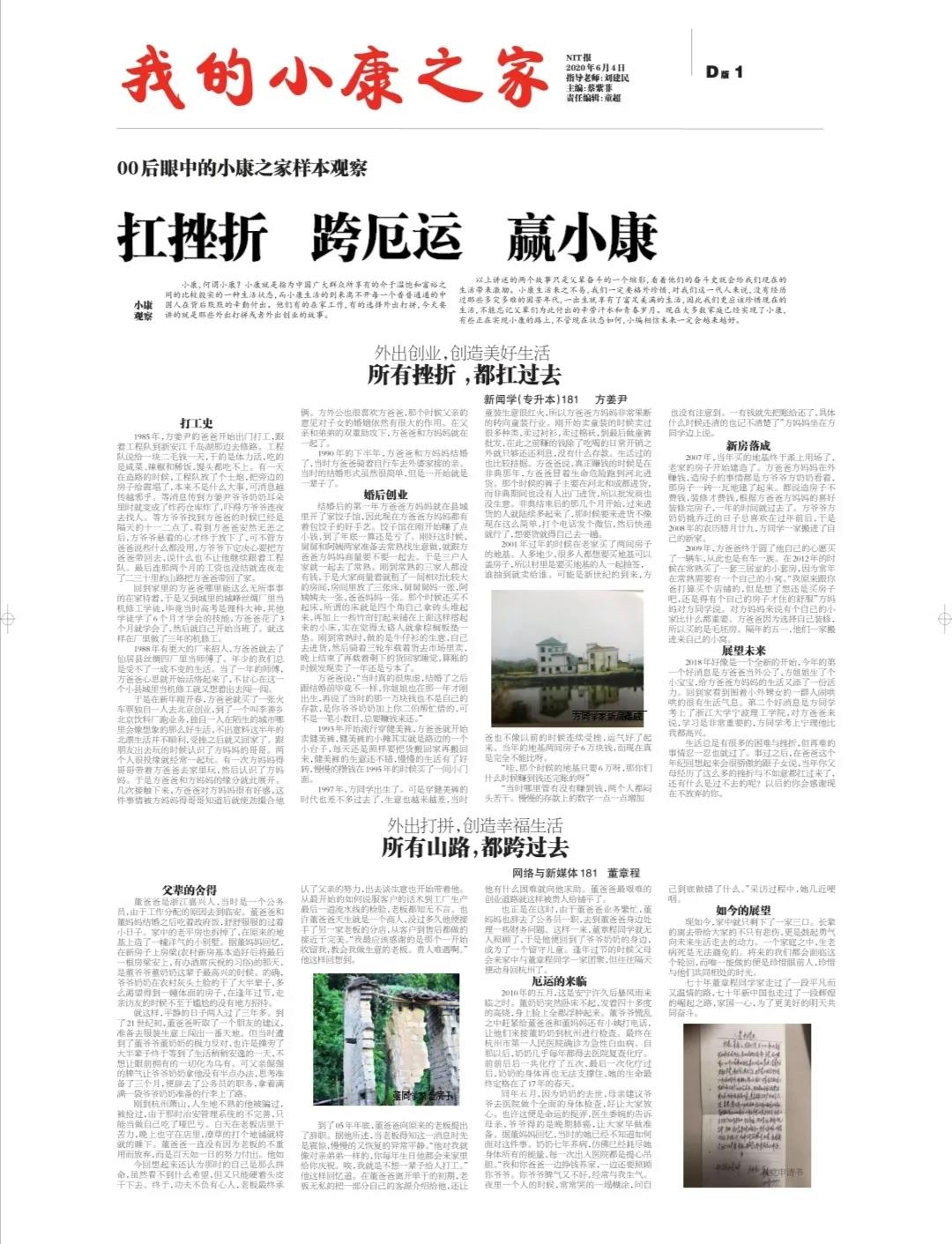 本组主要结合了人物关系的思路来整合小康之家的奋斗故事,版面由逐梦父女俩、寻梦兄弟俩、追梦父子俩、筑梦夫妻俩构成,他们是来自不同时代不同省市的平凡人物,相同的是都在为自己的小康之家而努力打拼。在该版面,读者可以从这些不尽相同的几种人物关系中感受他们所带来的励志且温暖的故事。