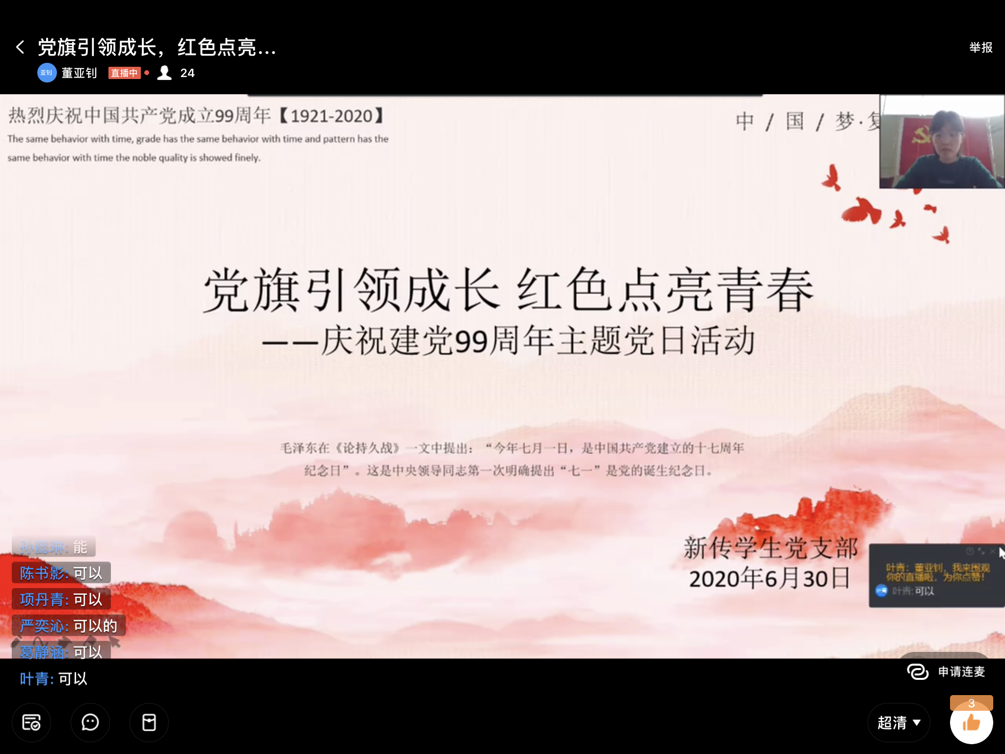 活动伊始,支部书记董亚钊老师和与会党员分享了罗斯·特里尔的《毛泽东传》。董老师讲到,本书不仅再现了以毛泽东同志为首的中国共产党的领袖们波澜壮阔的革命生涯,而且还将伟人的光辉品质和丰富内蕴展示出来,在今天读来另有一番震撼。在全面建成小康社会的收官之年,在座的各位青年党员应感激感动感恩于为中华民族解放和富强努力奋斗着的共产党员们,也应倍感时代赋予青年党员的光荣使命和压力,作为奔涌的后浪,要努力为中华民族的伟大复兴不懈奋斗!