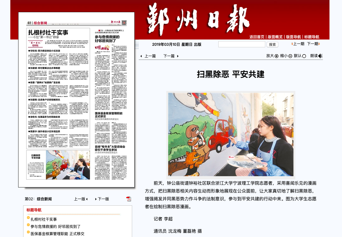 该项目以“挖掘内在文化,塑造特色之美”为宗旨,通过发挥师生志愿者们的专业技能和个人所长为社区提供两方面服务,对内主要是设计社区IP形象、制作原创公益海报、美化和改造社区“四面”等;对外则是围绕社区文化宣传,开展田野调查并以新媒体作品形式实现输出、打造文化公益展览等。项目已开展2年,2019年参与活动人数超过272人,服务时长达1187小时,已推进繁裕社区、黄鹂社区等地的文化氛围提升,发挥了对居民的引领作用,多次受到浙江团省委微博、钱江晚报客户端、宁波晚报等媒体的报道关注。