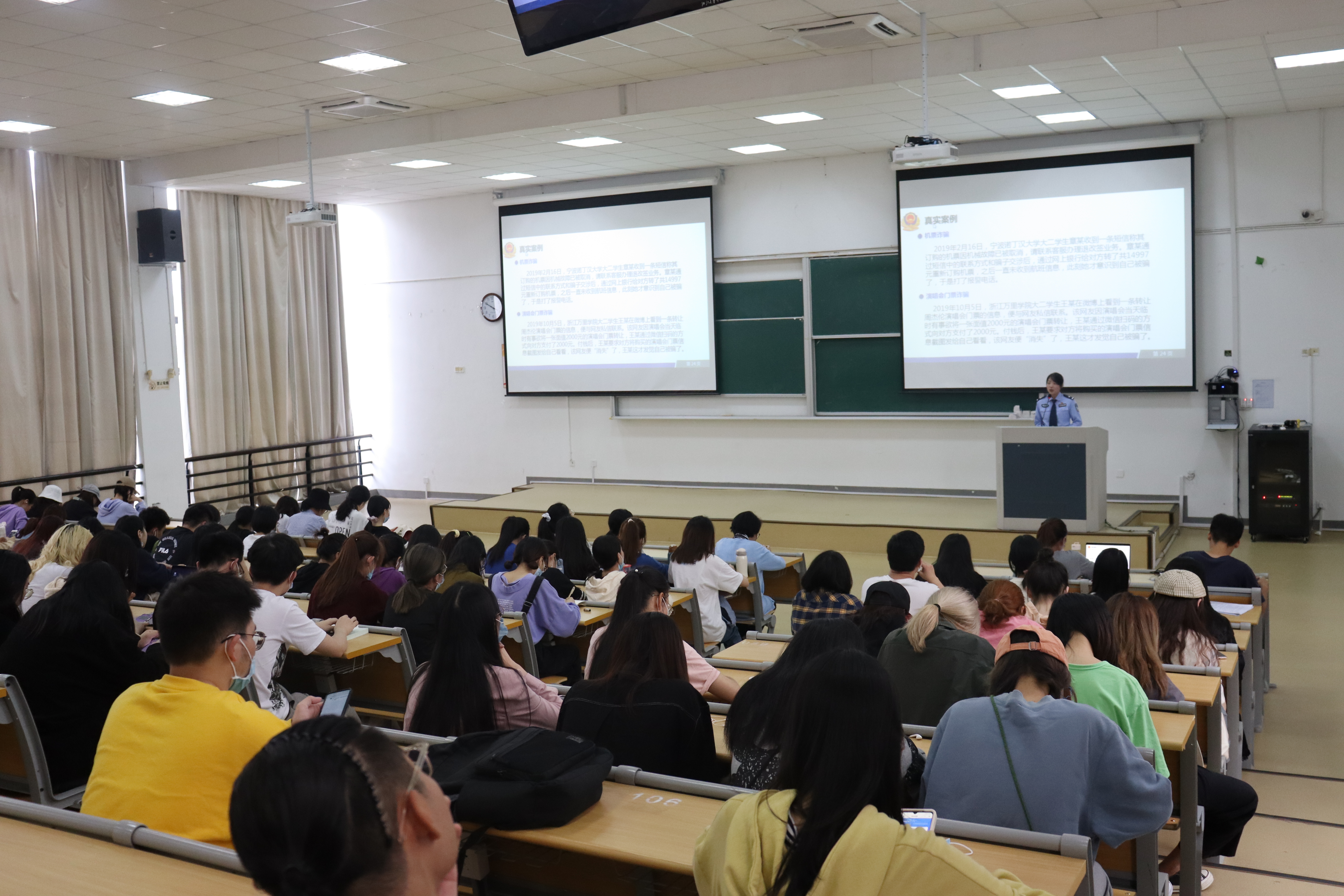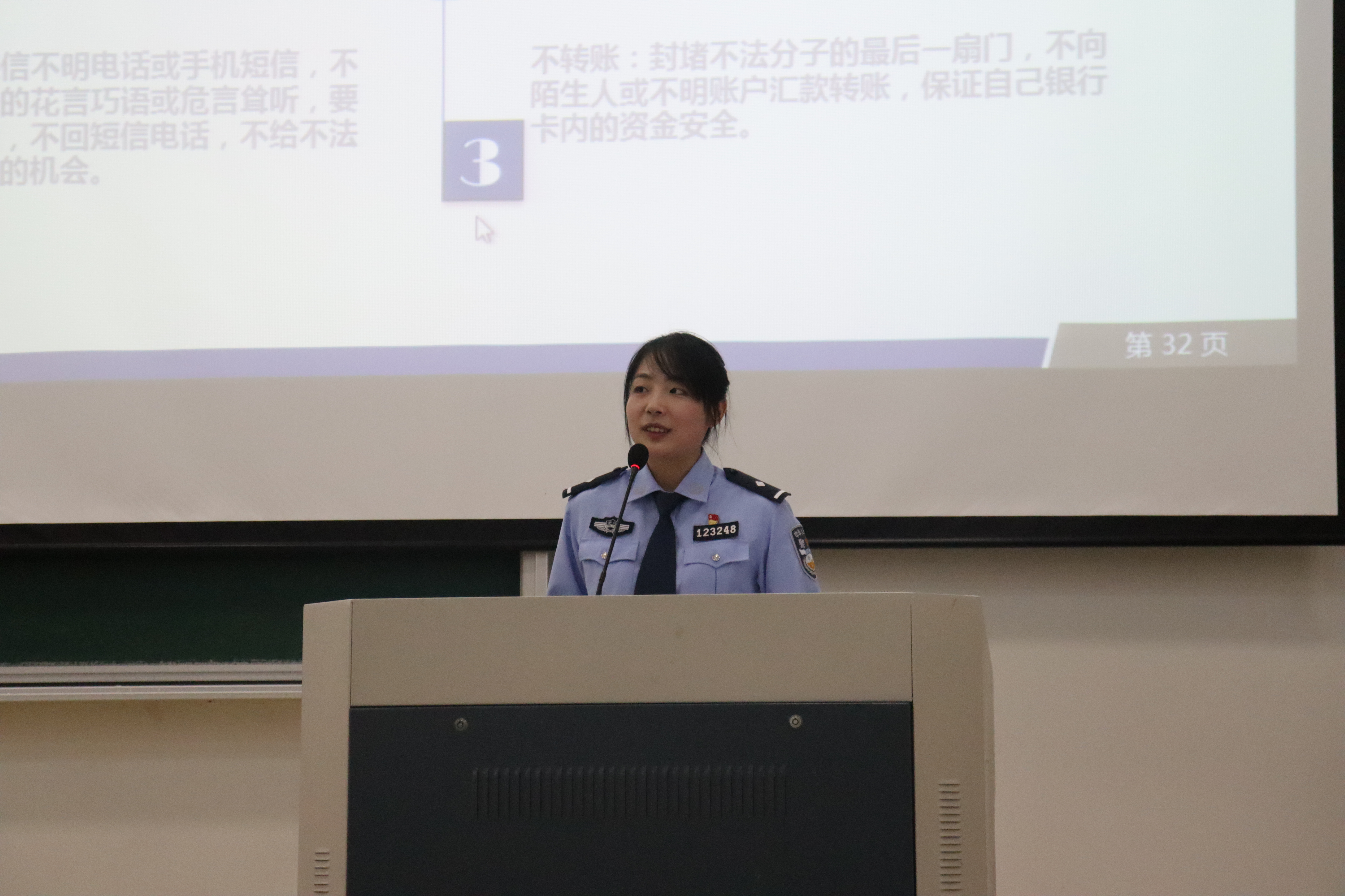 张警官结合生动漫画、大量真实案例从防范电信诈骗和禁毒两大模块展开主题宣讲:其一,详细介绍了电信网络诈骗的具体概念与常见类型,引申出了有效的防范措施、补救措施等,强调同学们需要树牢防电信网络诈骗意识;其二,从毒品的种类、基本特征、吸毒危害三个方面进行讲述,帮助同学们对毒品产生更深刻的认识,引导大家自觉遵守法律法规,做到“拒绝毒品,阳光生活”。