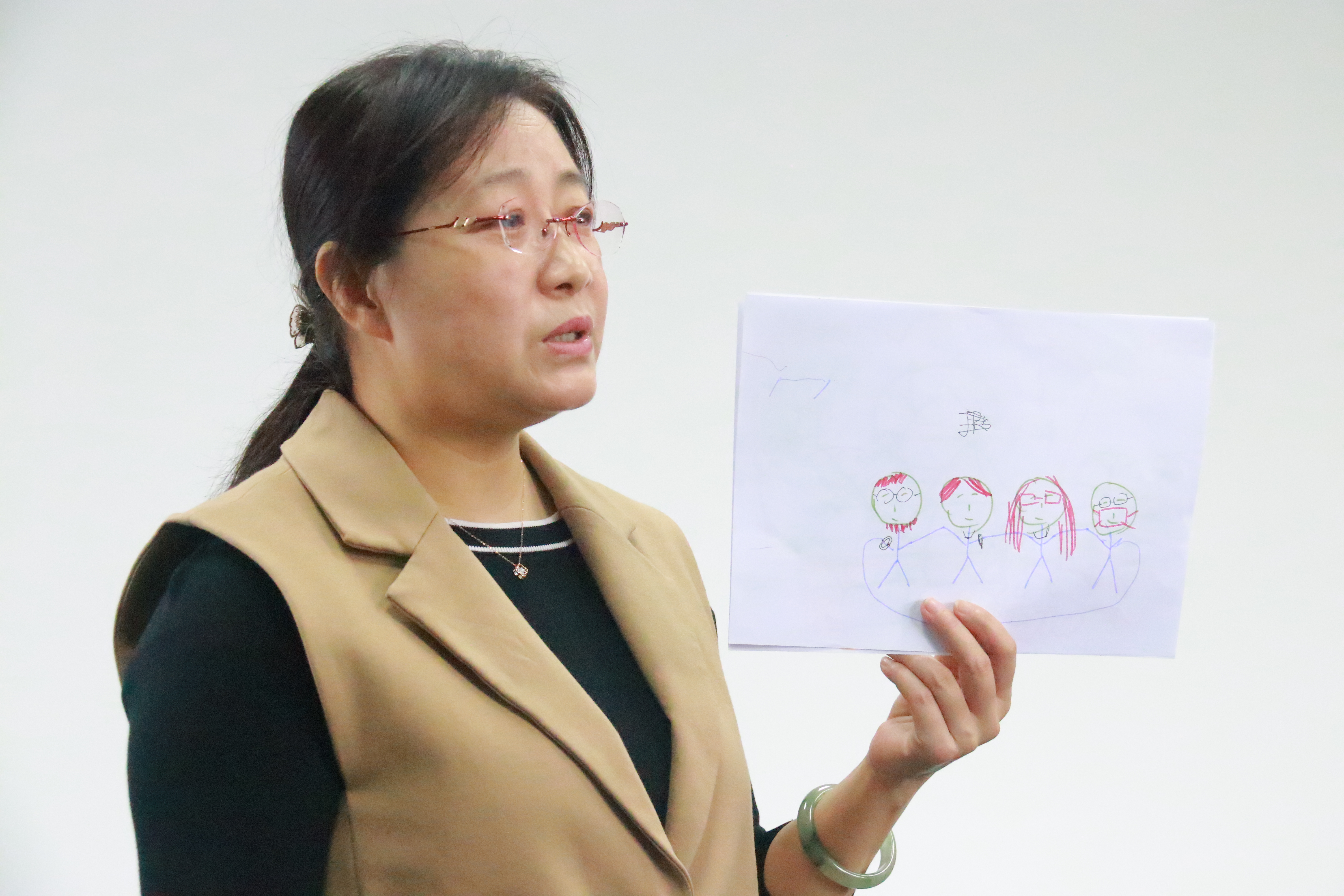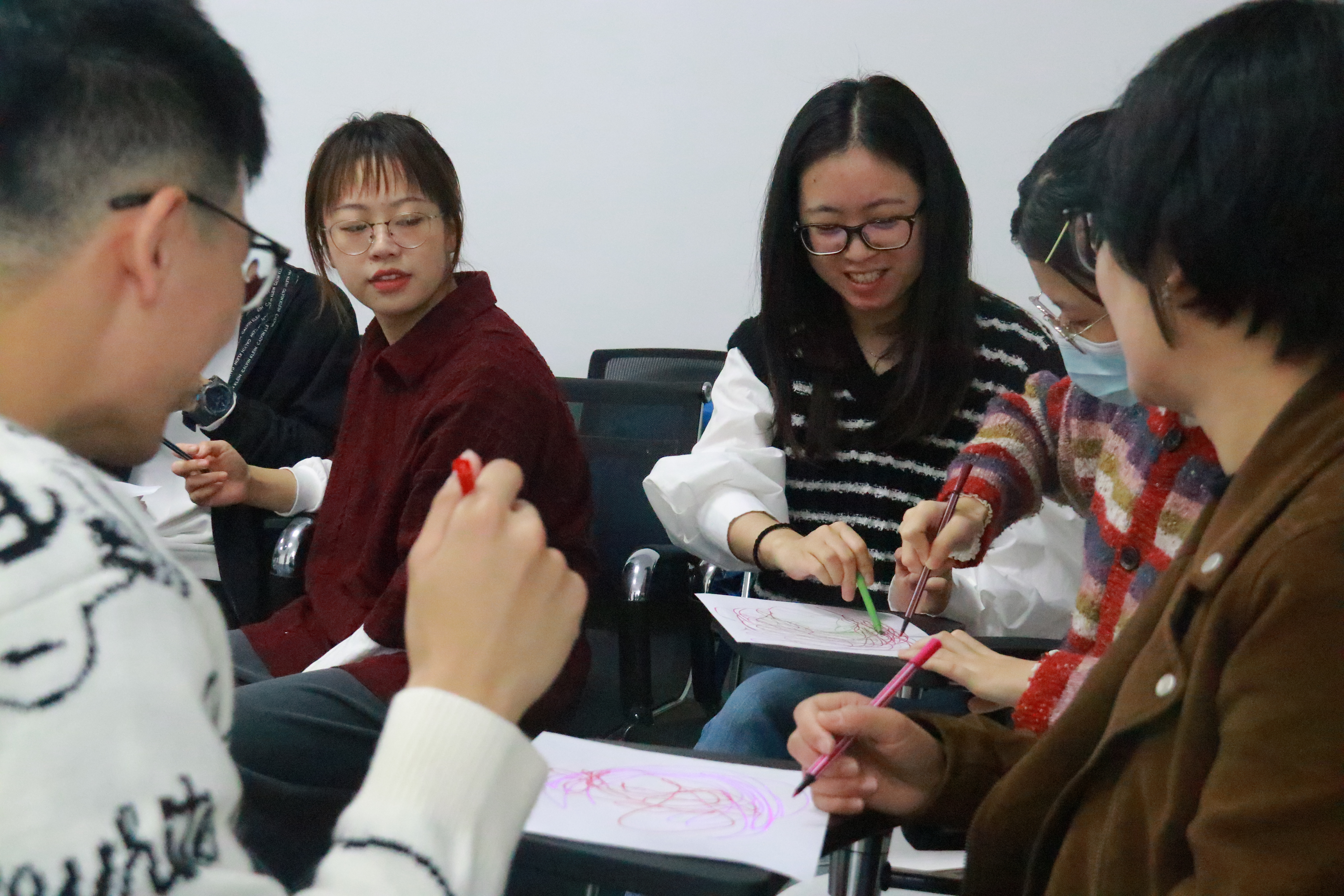 随后,大家又展开了第二轮游戏。4人一组围坐,并给这临时组建的团队取名,团队成员每人30秒时间轮流在纸上作画。游戏结束后,朱小红老师依次请大家发言讲解画作内容,也对大家的画作做了分析。朱小红老师表示,绘画是对内心世界的一个投射,通过简单的画作就可以反映一个人的内心真实世界,同时欢迎大家在需要心理疏导的时候来找她并用这种简单的方式分析自己的内心世界。