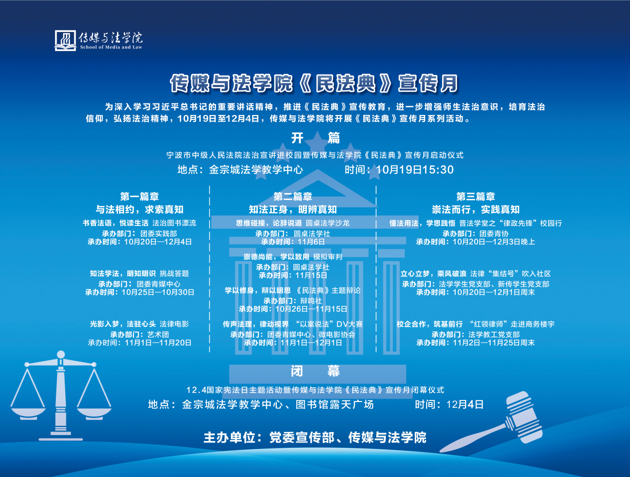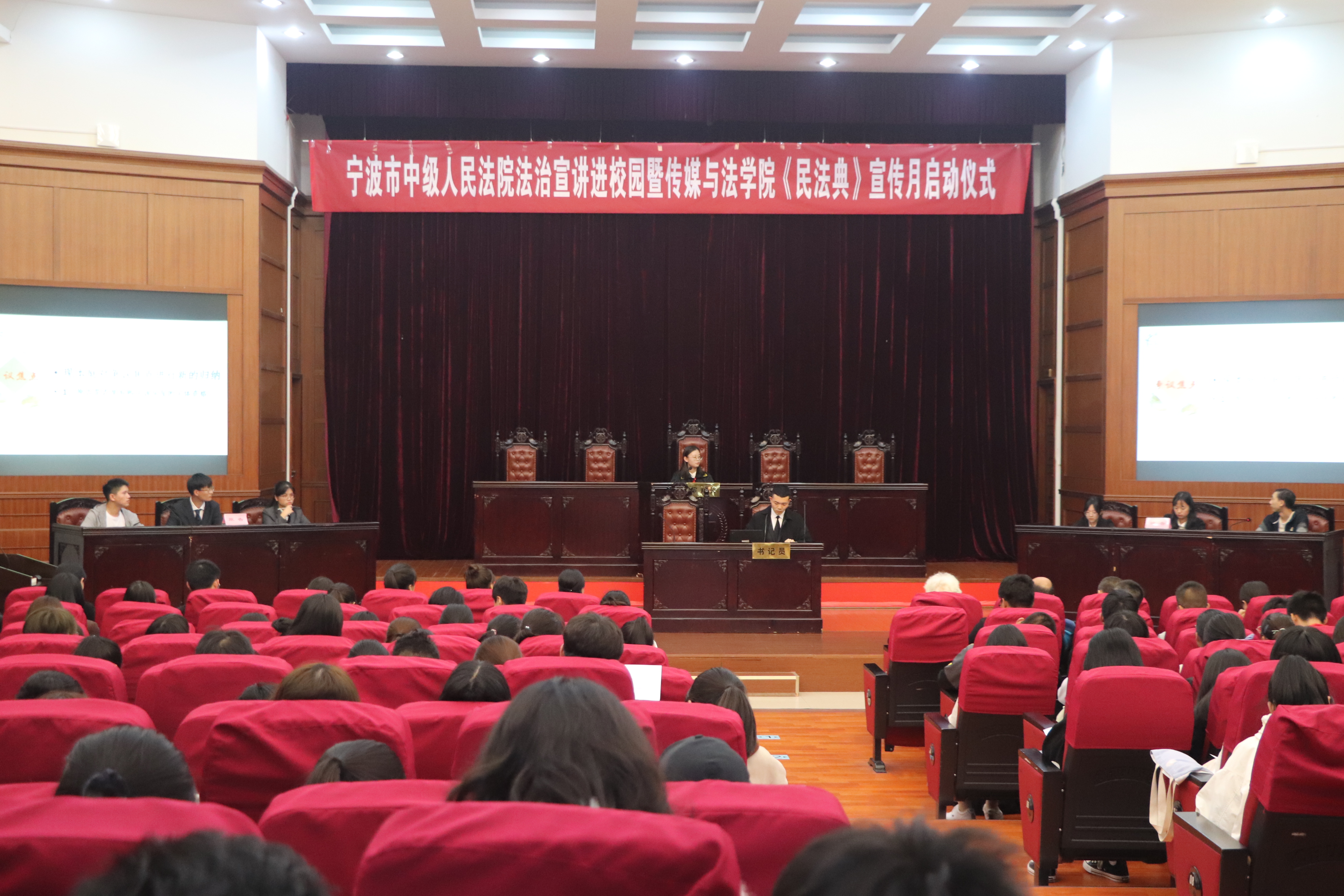 为深入学习习近平总书记的重要讲话精神,推进《民法典》宣传教育,进一步增强师生法治意识,培育法治信仰,弘扬法治精神,10月19日下午,宁波市中级人民法院法治宣讲进校园暨304永利集团《民法典》宣传月启动仪式在永利集团金宗城法学教学中心举行。宁波市中级人民法院清算与破产庭庭长蔡惠娜、员额法官张颖璐、法官助理常黎阳、法官助理王舒蒙受邀参加活动并进行了交流与分享。此外,304永利集团副经理韩缨,公司党委副书记、纪委书记胡鹿鸣,宁波市致公党综合一支部党员和宁波理工公司支部党员也到场观看。