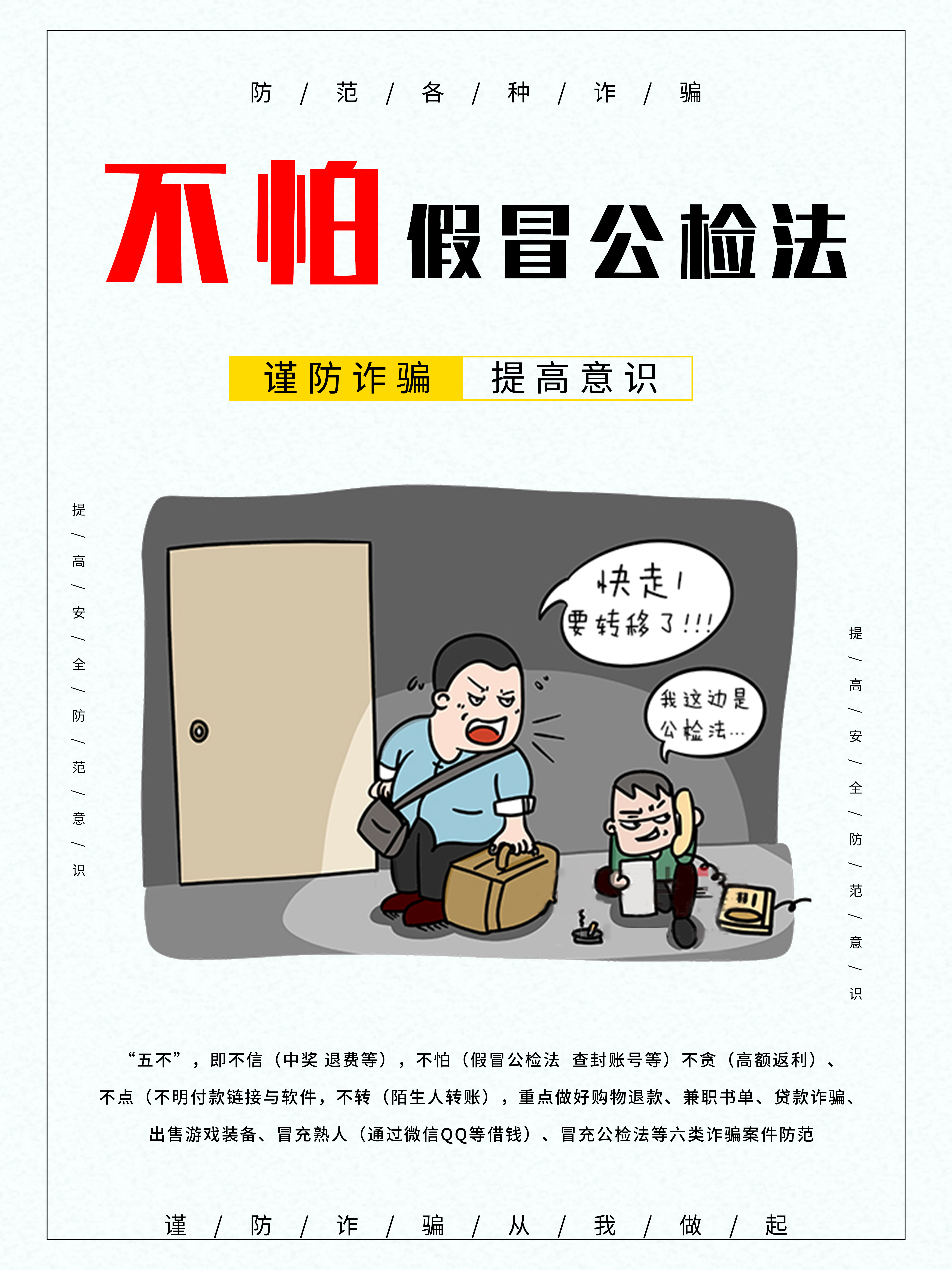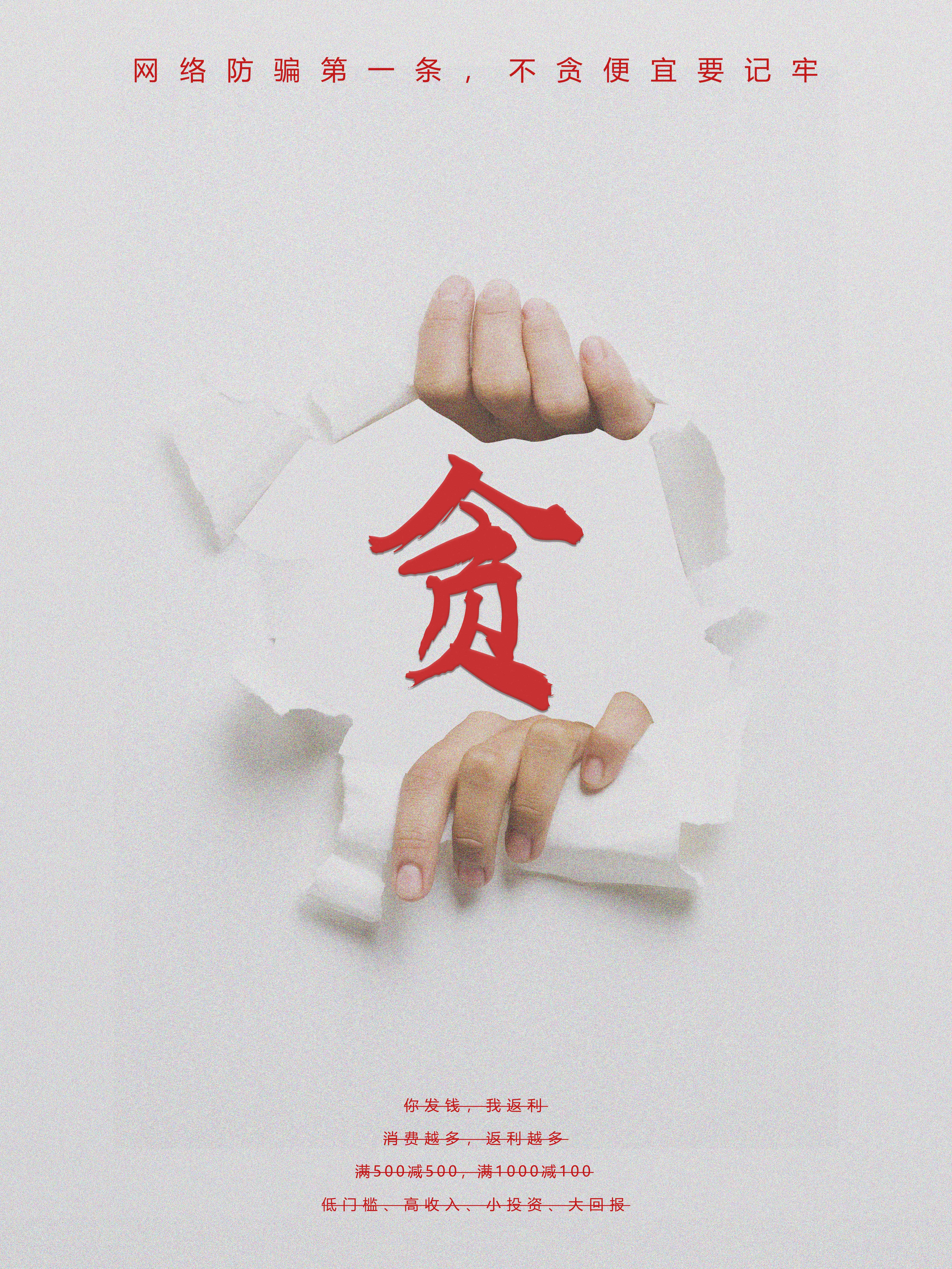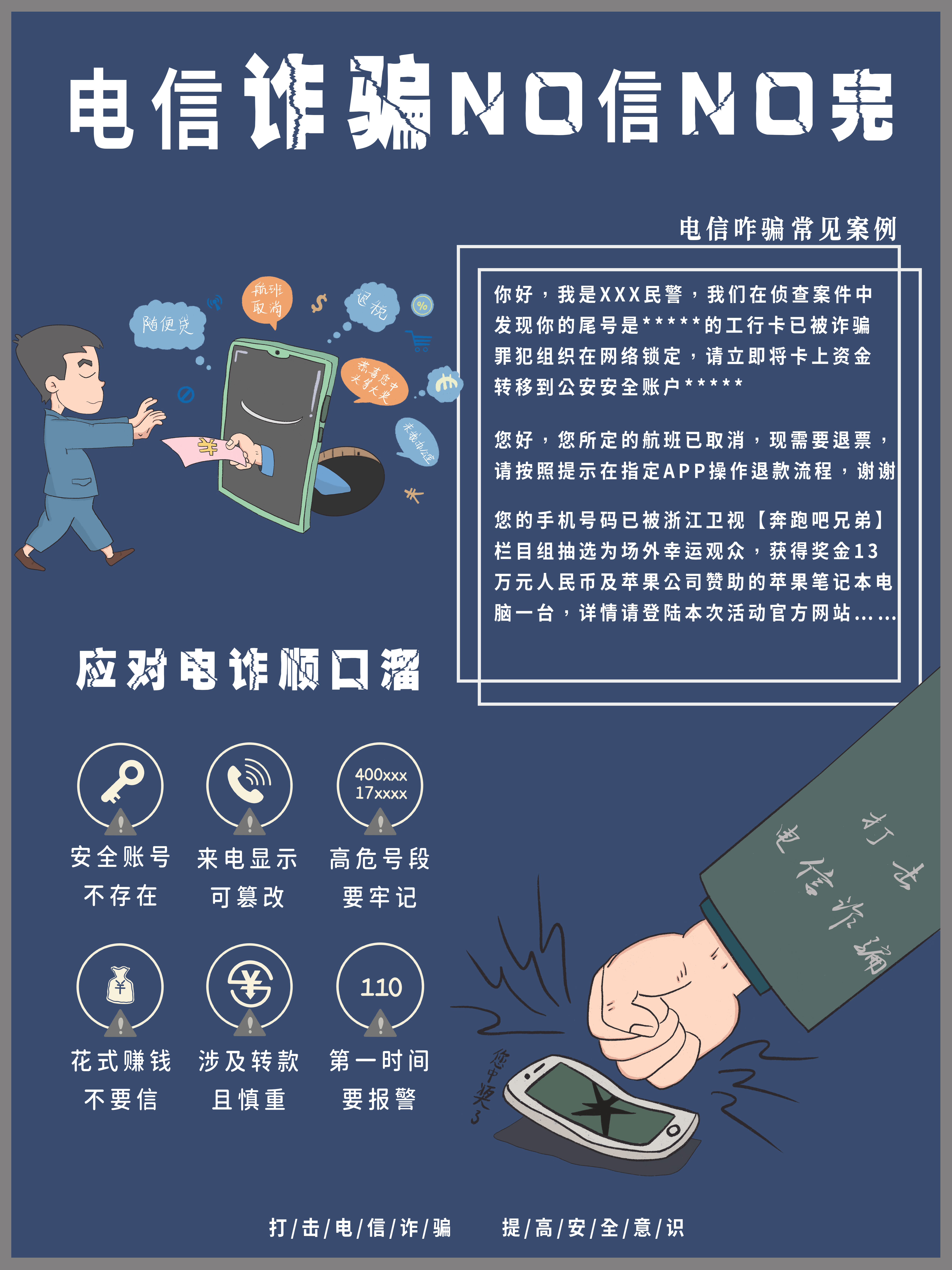 海报作品围绕防诈骗主题,重点强调“五不”即“不信 (中奖 退费等)不怕(假冒公检法 查封账号等)不贪(高额返利)不点(不明付款链接与软件)不转(陌生人转账)”,做好购物退款、兼职刷单、贷款诈骗、出售游戏装备、冒充熟人(通过微信QQ等借钱)、冒充公检法等六类诈骗案件的防范宣传教育。本次活动共收到了34件作品,经过评审,优秀作品将线上线下展出,进一步扩大影响力。
