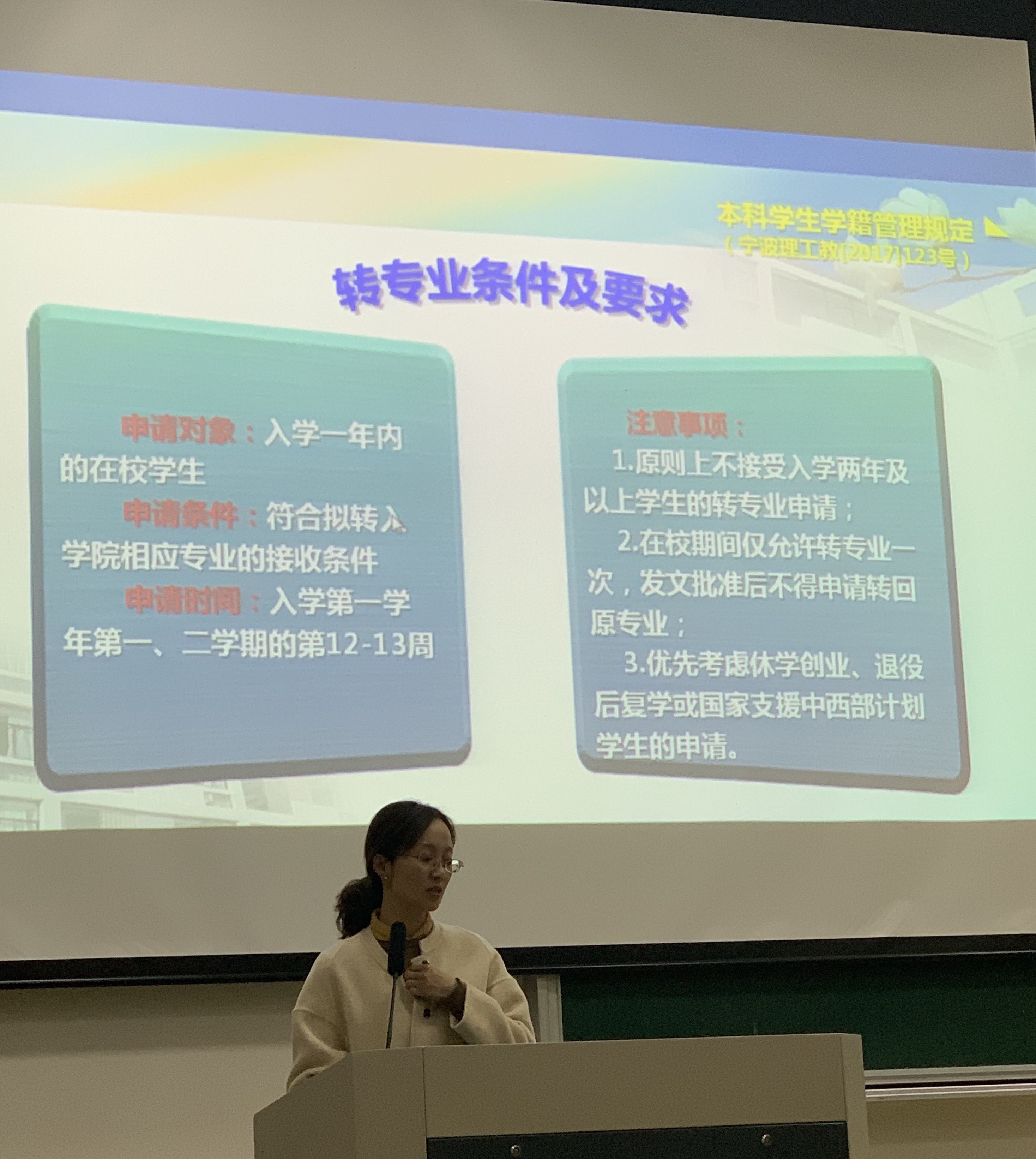 随后,董亚钊老师就考勤管理、评奖评优、资助工作、公寓管理、违纪处分等5个问题进行详细讲述。董老师强调了公司的相关规定并说明了请假流程以及特殊情况的应对办法,对其中的重点、难点的条款进行解释,希望大家提高遵纪守纪意识,不抱有侥幸心理,不贪图一时的利益。