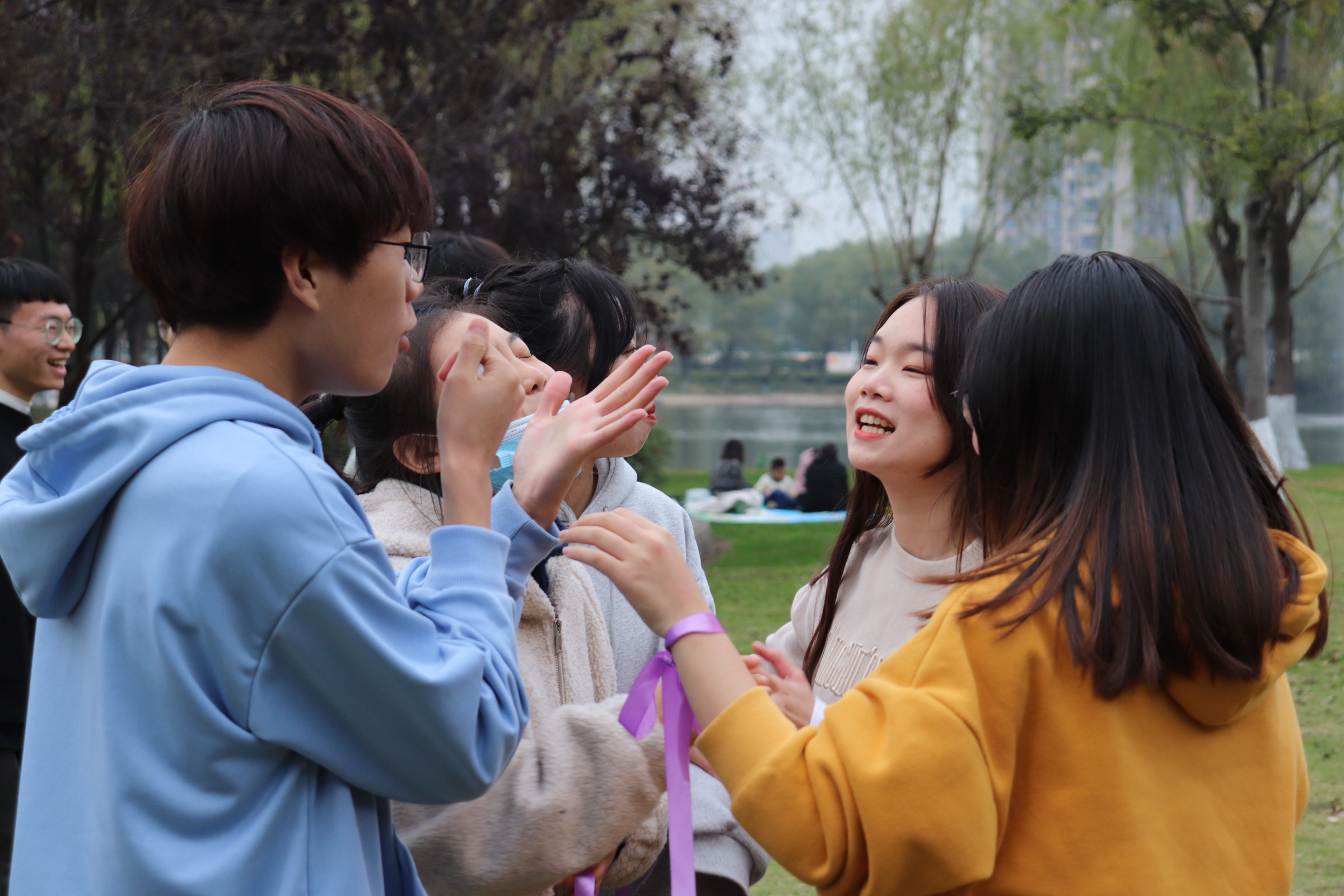 破冰环节,同学们通过抽签随机分成了9组,并佩戴上了相同颜色的丝带,迅速熟悉认识同组成员。在主持人宋朝介绍完素质拓展规则后,各组成员热烈讨论、集思广益,共同寻找获胜的窍门。随后,进行了接力不NG、一站到底、青春抱抱团等项目挑战,大家更是全力以赴,争分夺秒,配合默契,为自己团队的胜利努力拼搏。