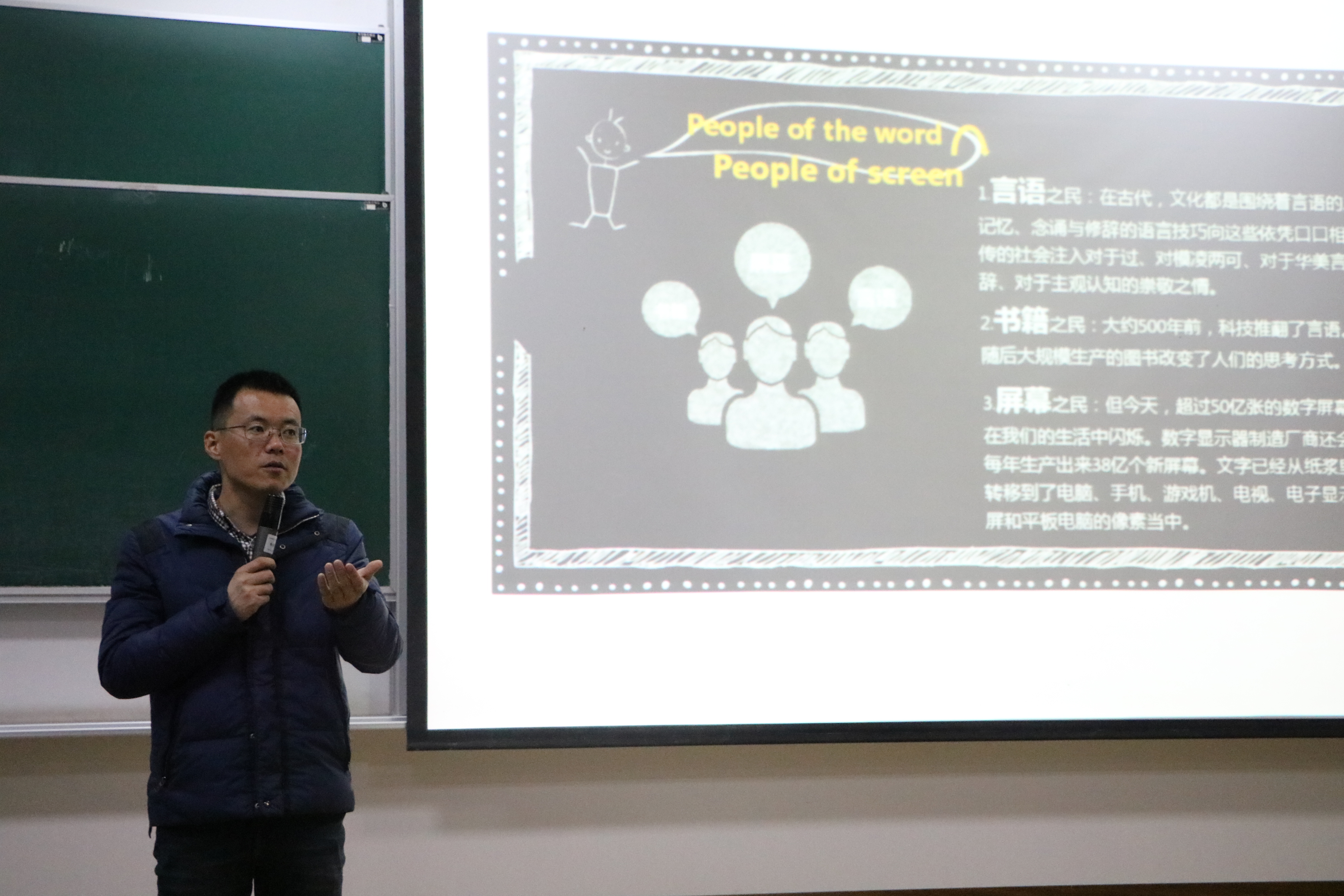 讲座从“历史视野下书与阅读的形态变迁”,“一个图书馆员的阅读史与阅读观”,“传法公司阅读力分析——图书馆的视角”,“在甬员工的‘四知精神’书单荐读”四个角度展开论述。讲座中,刘杰老师先提出了“书是什么”的问题,随后顺着历史的长河,对于阅读形态的变化做了系统的讲述。之后,针对“书的定义”,“读是什么”,“屏读与纸读的区别”,“人类为什么要阅读”等问题进行了展开。在讲座中,刘杰老师也分享了自己的读书经历与读书经验,其中更是穿插讲述了自己的阅读观。最后,刘杰老师用数据展示了阅读与304永利集团的渊源之深,并且将阅读与每一个员工个体密切联系了起来。刘杰老师的讲座内容丰富,并且在讲座的过程中,举出多个生动的例子,让这些问题的答案更为生动形象,深入人心。这次的讲座让同学们更清楚,更系统的了解了阅读的发展历程,不同的阅读方式带来的影响,以及阅读的重要性,可谓是受益颇丰。