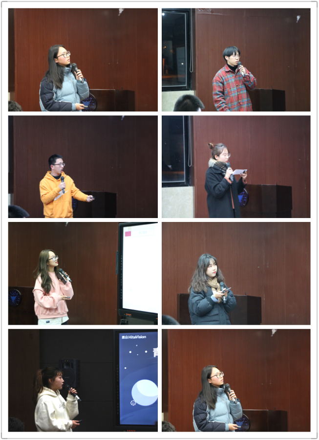 会议伊始,各部门的干部代表结合PPT对部门一学期工作进行总结,主要围绕部门建设、工作成果、工作特色、不足与展望等几个方面。其中,学联心理部回顾了过去一年中部门负责的主要事项,如疫情期间心理小票的审核、公司新成立后相关细则的完善等,展现了在遇到问题时部门成员齐心协力、积极思考、砥砺前行。团委青媒中心影视部针对部门工作中所发现的问题提出了相关的解决措施,例如录制钉钉课程对部门成员进行统一的视频技术教学,并且布置了相应的工作来锻炼和提升拍摄水平,此外,部门还发起了每日英语学习打卡活动等。团委青协志愿者部在继续做好宁波博物馆、图书馆和城市展览厅的文明劝导志愿服务工作的基础上,创新思维开展了“祝福冬至,平安宁理”活动,传递志愿者精神,为校园增添暖意……部门代表们激情澎湃的讲述赢得现场阵阵掌声,展现出了传媒与法团学的风采。团委书记曲昊杨在最后的讲话中表达了对团学各部门工作的肯定和对同学们辛苦付出的感谢,也阐述了下学期团学的发展规划,指出团学工作要立足时代背景,契合公司、公司发展节点,贴近同学,服务同学;团学成员要注重完善自我,更好地成长成才。