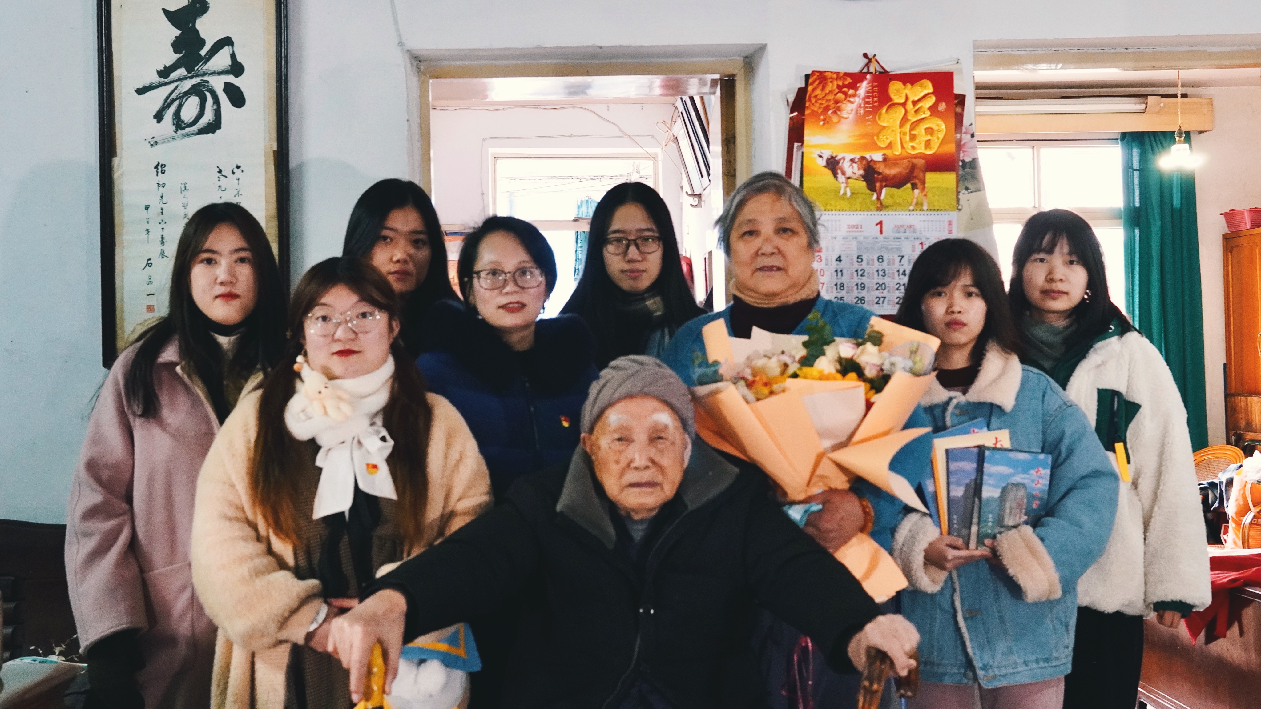 1月9日上午,李倩倩老师带领6位同学前往宁波市海曙区白云山庄慰问采访退休干部葛石峰同志。葛老先生今年96岁,历经一个世纪的洗礼仍然容光焕发。他曾多次参战,在解放战争及抗美援朝战争中表现十分勇猛。一个台风呼啸的夜晚,葛石峰同志及其战友共三人乘一小舟夜渡大河执行北撤的命令。期间战友受伤,他偶遇岛民并求助,恰好岛民一直以来对新四军心怀感恩,热情援助他们一行人。葛石峰同志讲述的这段经历十分生动,在场的同学放佛身临其境,不禁赞叹葛石峰同志机敏勇敢的行为。