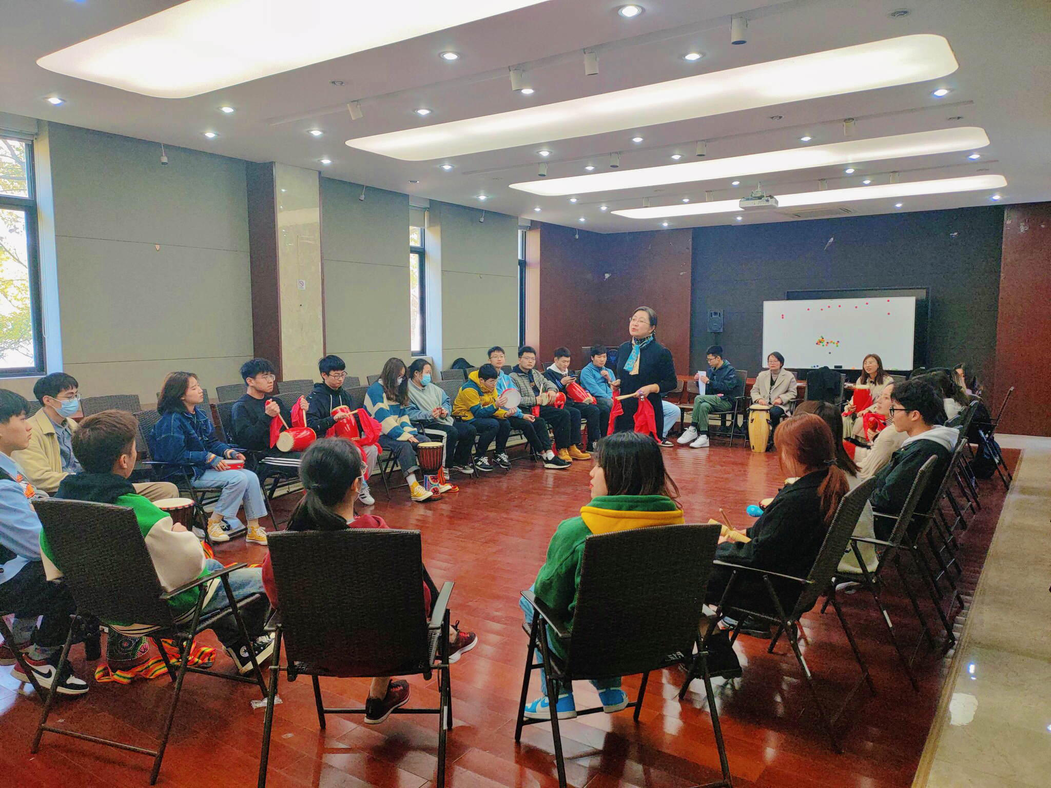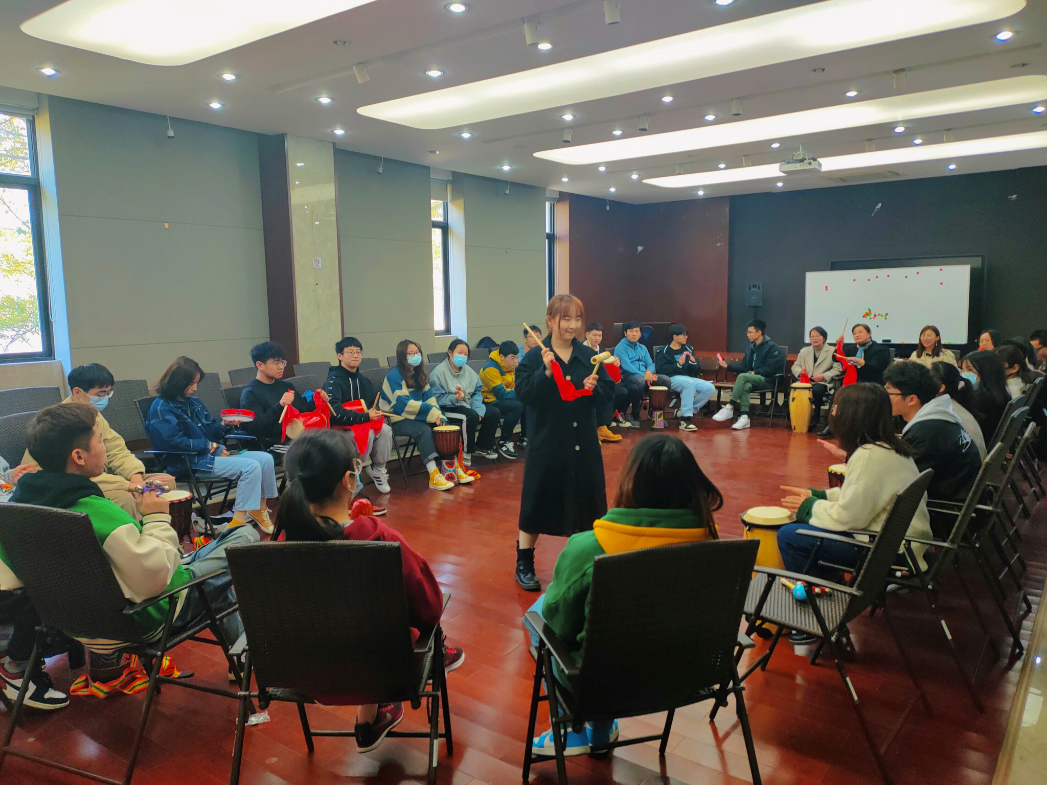 活动伊始,参与者围坐一圈,在各种类型的乐器中挑选了自己喜欢的一种用来彼此对话。朱小红老师在手势和语言的引领下,参与者紧紧跟随变换手中乐器的节奏,现场的氛围顿时活跃了起来。随着活动的深入,大家之间的距离从疏离到逐渐默契,时而击打、时而停止、时而鼓声齐鸣、时而单打独奏。随后,朱小红老师与大家转换身份,邀请老师与同学们作为指挥者参与并体验其中。在大家积极的创作中,鼓声的节奏愈加丰富,同学们的热情愈加高涨,焕发了青春的活力。最后,在朱小红老师的引导下,大家积极发言说出自己参与其中的感受和心得。