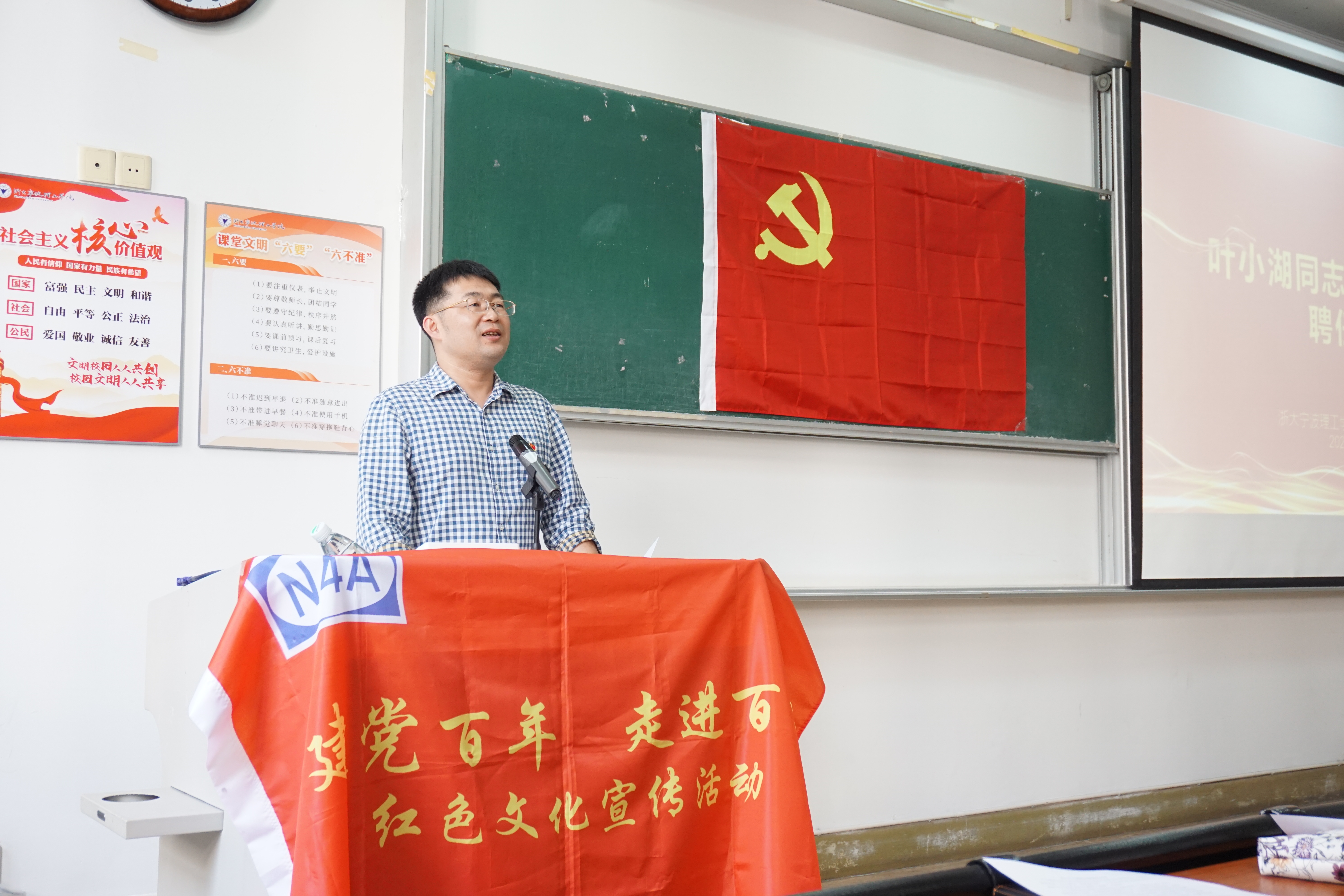 适逢中国共产党成立100周年,为深入扎实开展党史学习教育,传承红色基因,加强公司思政队伍建设,5月25日下午,公司党委在SC204举办了“红色讲坛”第五讲暨叶小湖同志兼职思政导师聘任仪式,参加此次活动的有公司党委副书记(主持工作)、副经理朱小红,公司党委副书记、纪委书记胡鹿鸣,全体思政辅导员和在校员工党员、入党积极分子,活动由公司党委组织委员、法学员工党支部书记赵红主持。