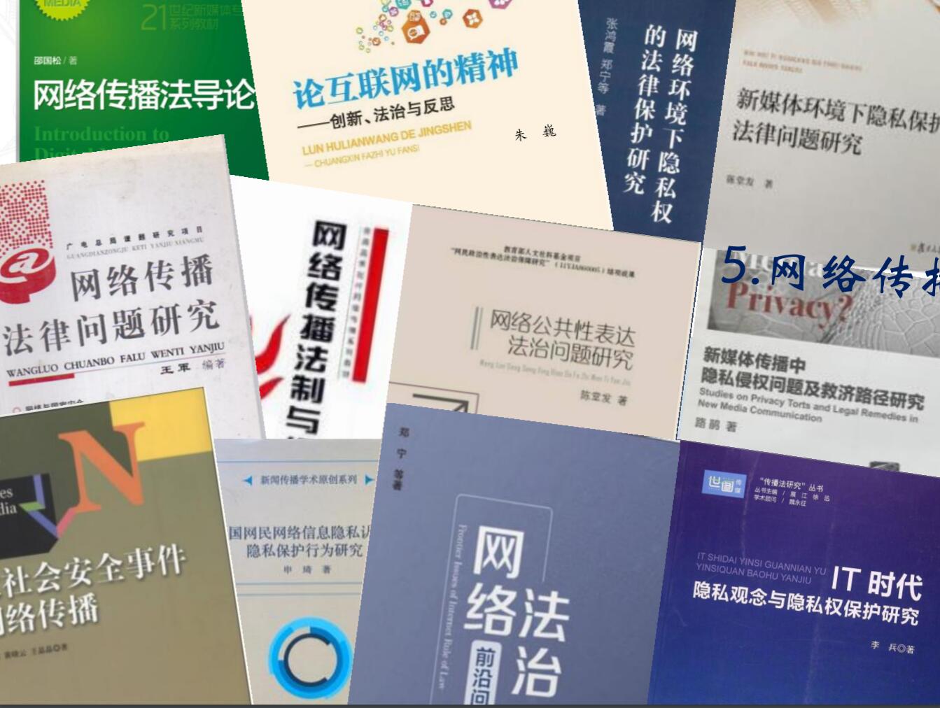 第五块是网络传播。网络现在已成为我们社会生活的一个基础设施,有关研究领域十分广泛。仅就网络传播这方面的研究,比较完整的是邵国松《网络传播法导论》。王军《网络传播法律问题研究》是世纪初较早的一部传播法涉网著作。朱巍的《论互联网的精神》,是他有关互联网论述的文集,贴近现实,为互联网治理绘制了一幅相对完整的图画。还有陈堂发《新媒体环境下隐私保护法律问题研究》和《网络公共性表达法治问题研究》,是今年获奖的两部作品,代表了相当的水平。目前若干学人集中于研究网络隐私权和个人信息保护,这里有:张鸿霞和郑宁《网络环境下隐私权的法律保护研究》、路鹃《新媒体传播中的隐私权问题研究》,李兵《IT时代隐私观念与隐私权保护研究》、申琦《中国网民网络信息隐私认知和隐私保护行为研究》等,都体现了对这方面的关注。总而言之,对于网络传播的法律研究,目前仍处于方兴未艾状态。