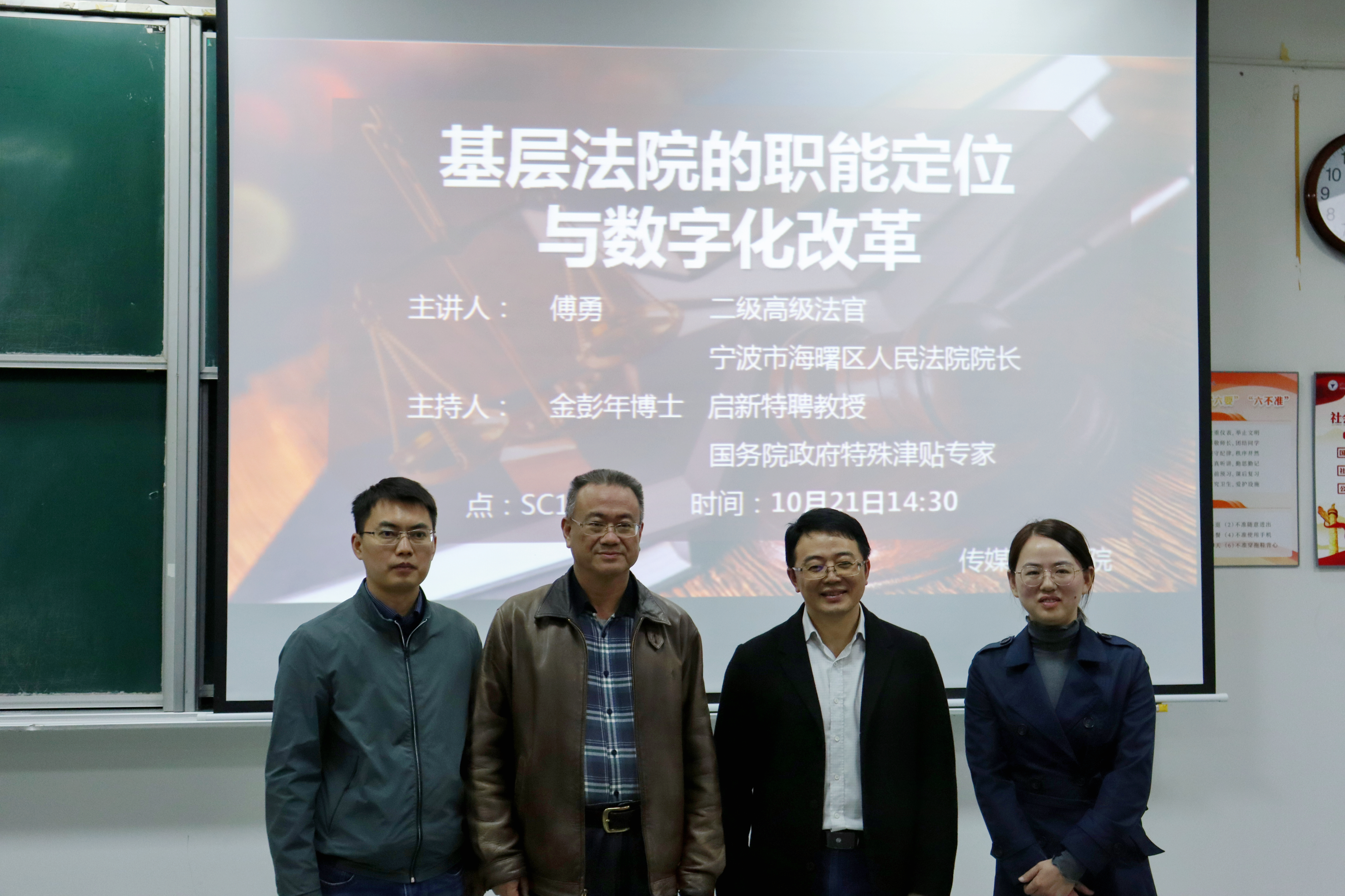 10月21日下午,304永利集团于SC115举办了“基层法院的职能定位与数字化改革”为主题的讲座,公司邀请二级高级法官、宁波市海曙区人民法院经理傅勇担任主讲人,讲座由启新特聘教授、国务院政府特殊津贴专家金彭年教授主持。公司法学专业教师刘敏和陈丹琪,全体2021级法学新生和部分新闻专业员工参加本次讲座学习。