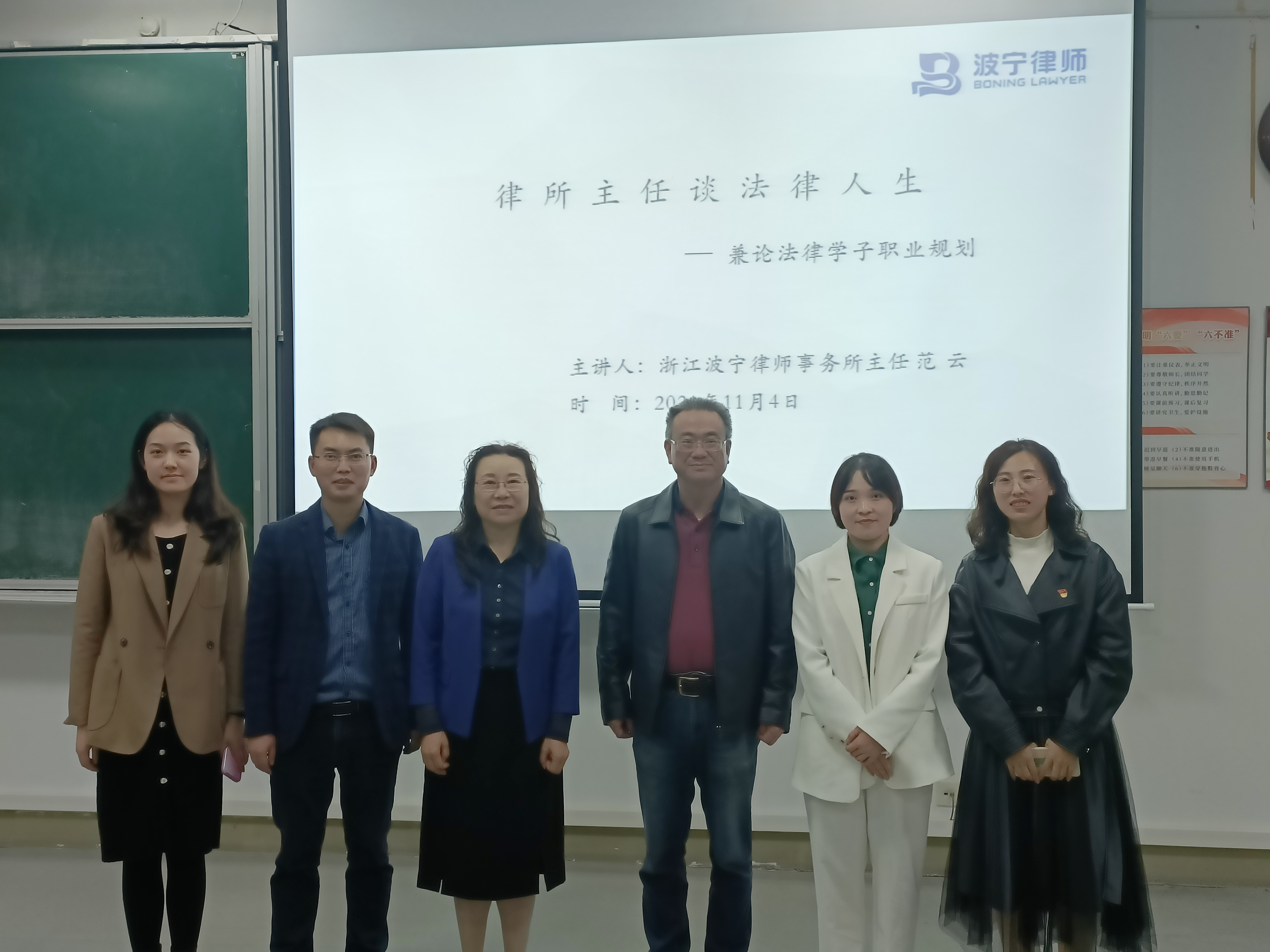 范云律师首先介绍了自己“下海”创办律所的经历和多年积累的荣誉,重点分析波宁律师事务所的发展历程,从文化建设、业务、交流与培训等方面入手,让全体同学对宁波知名律所的企业文化有初步的了解。随后,范云律师向广大法律学子做了职业规划指导,具体分析了考研、律师、公务员、公司法务四种方向的不同要求与利弊。并给出了四条建议:第一,了解社会形势与任务,了解法员工就业方向;第二,了解企业就业需求,如个人能力与性格等;第三,了解个人就业需求,如地域、工作环境等;第四,了解不同行业的准入门槛。同时,范云律师强调了律师的职业操守、发展设计、职业渠道、必备素质,向同学们给出青年律师的成长建议。
