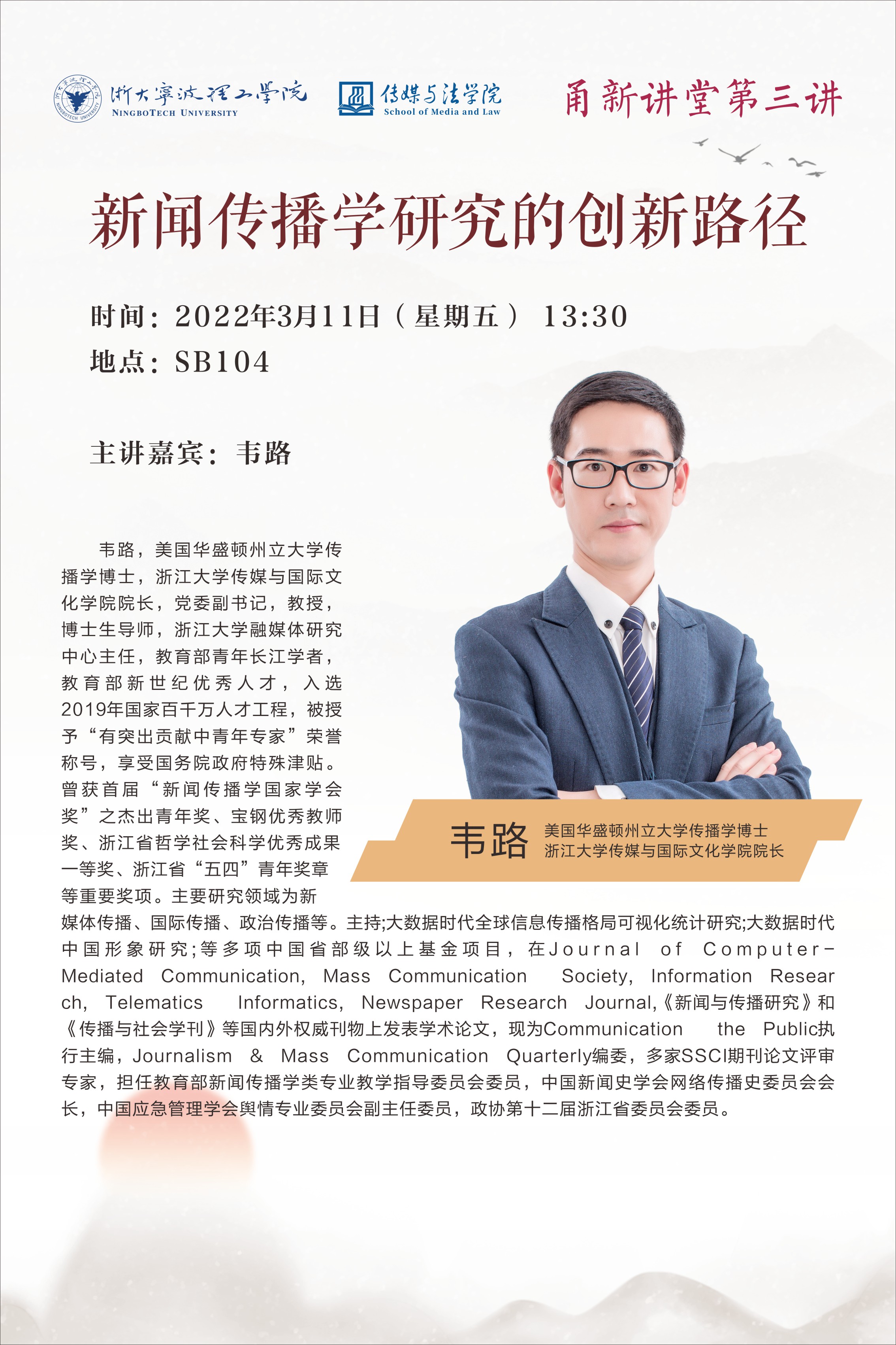 主讲嘉宾简介:韦路,美国华盛顿州立大学传播学博士,浙江大学传媒与国际文化公司经理,党委副书记,教授,博士生导师,浙江大学融媒体研究中心主任,教育部青年长江学者,教育部新世纪优秀人才,入选2019年国家百千万人才工程,被授予“有突出贡献中青年专家”荣誉称号,享受国务院政府特殊津贴。曾获首届“新闻传播学国家学会奖”之杰出青年奖、宝钢优秀教师奖、浙江省哲学社会科学优秀成果一等奖、浙江省“五四”青年奖章等重要奖项。主要研究领域为新媒体传播、国际传播、政治传播等。主持;大数据时代全球信息传播格局可视化统计研究;大数据时代中国形象研究;等多项中国省部级以上基金项目,在Journal of Computer-Mediated Communication, Mass Communication Society, Information Research, Telematics Informatics, Newspaper Research Journal,《新闻与传播研究》和《传播与社会学刊》等国内外权威刊物上发表学术论文,现为Communication the Public执行主编,Journalism & Mass Communication Quarterly编委,多家SSCI期刊论文评审专家,担任教育部新闻传播学类专业教学指导委员会委员,中国新闻史学会网络传播史委员会会长,中国应急管理学会舆情专业委员会副主任委员,政协第十二届浙江省委员会委员。