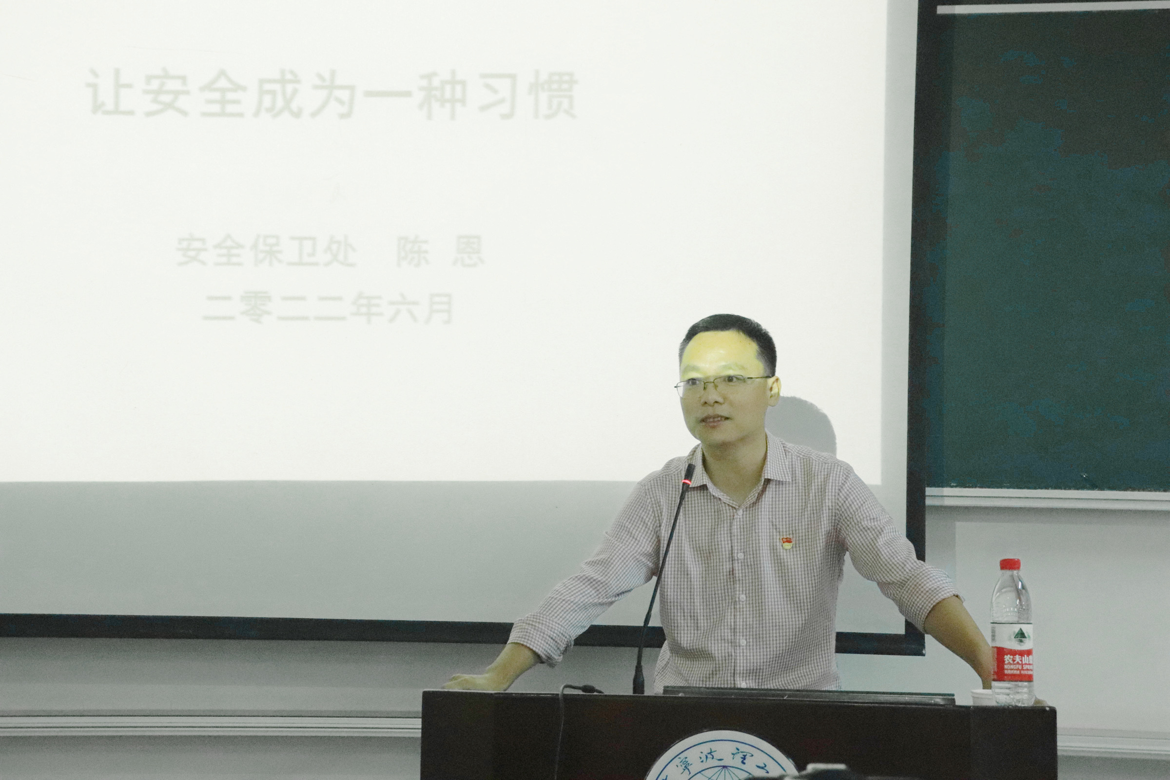6月10日下午,为助力文明校园建设,护航校园安全,304永利集团特邀保卫处副处长、保卫部党支部书记陈恩为同学们开展安全讲座。本次讲座也是安全保卫处(安全保卫部)党支部与法学员工党支部结对共建的特色党日活动。党委副书记、纪委书记胡鹿鸣,思政主管曲昊杨,法学员工党支部书记李倩倩,辅导员杨潮以及公司各班班长、法学员工党支部全体党员线下参加此次会议,公司全体寝室长线上参加。