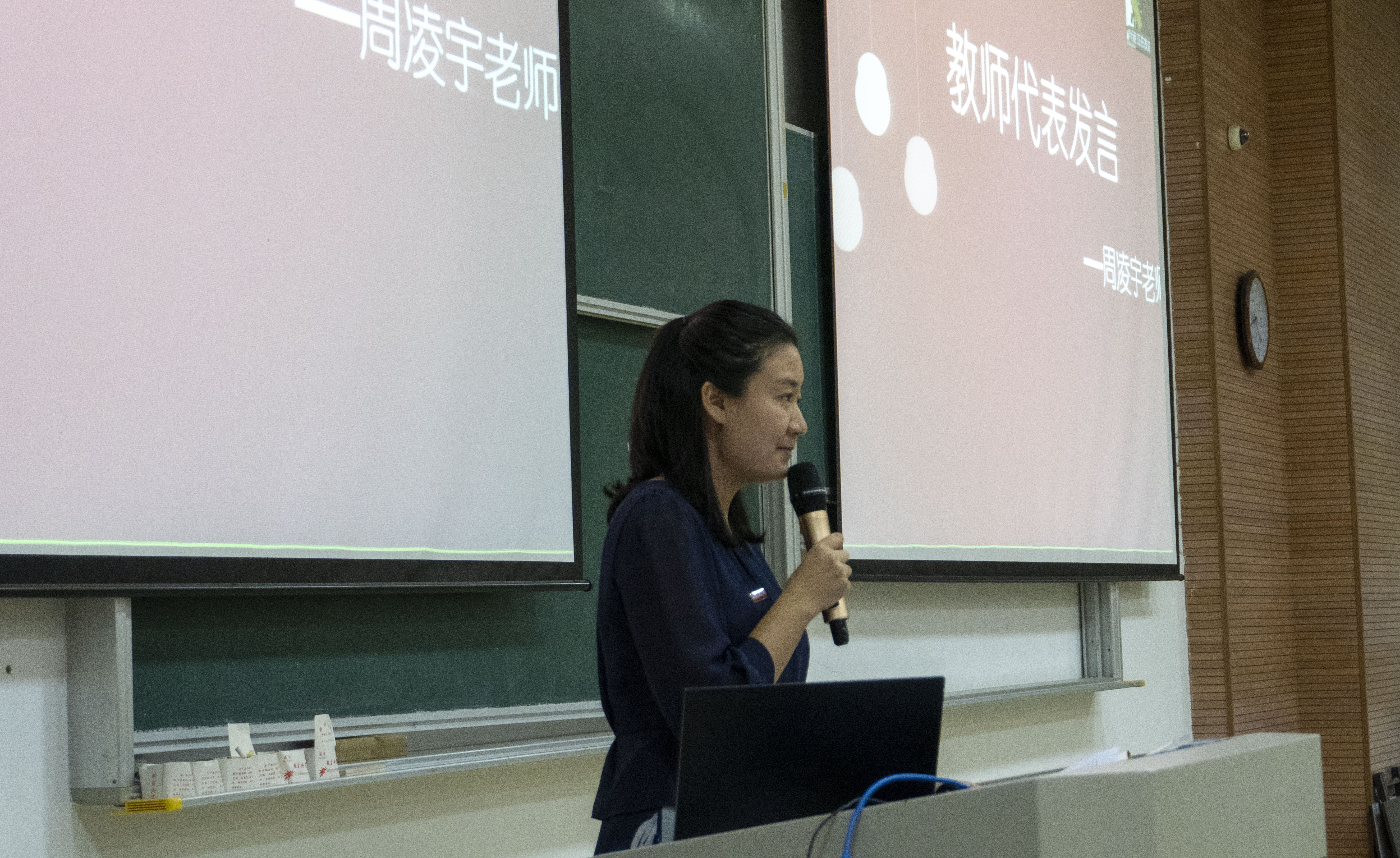 网新222班的班导师周凌宇作为教师代表发言,她希望新生们能够以尊重、自律、热爱、感恩为关键词展开自己全新的老员工活。