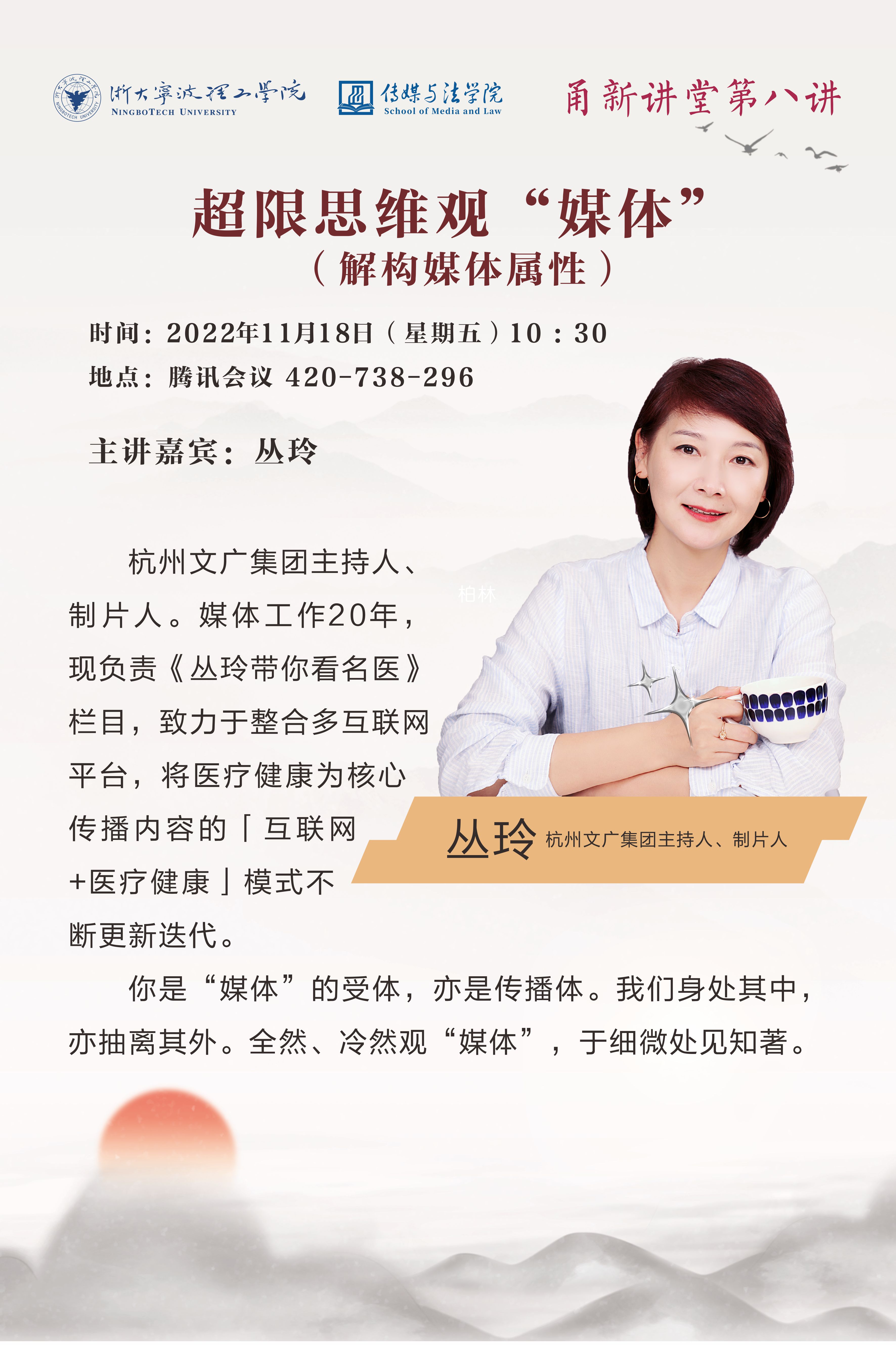 主讲嘉宾简介:丛玲,杭州文广集团主持人、制片人。媒体工作20年,现负责《丛玲带你看名医》栏目,致力于整合多互联网平台,将医疗健康为核心传播内容的「互联网+医疗健康」模式不断更新迭代。