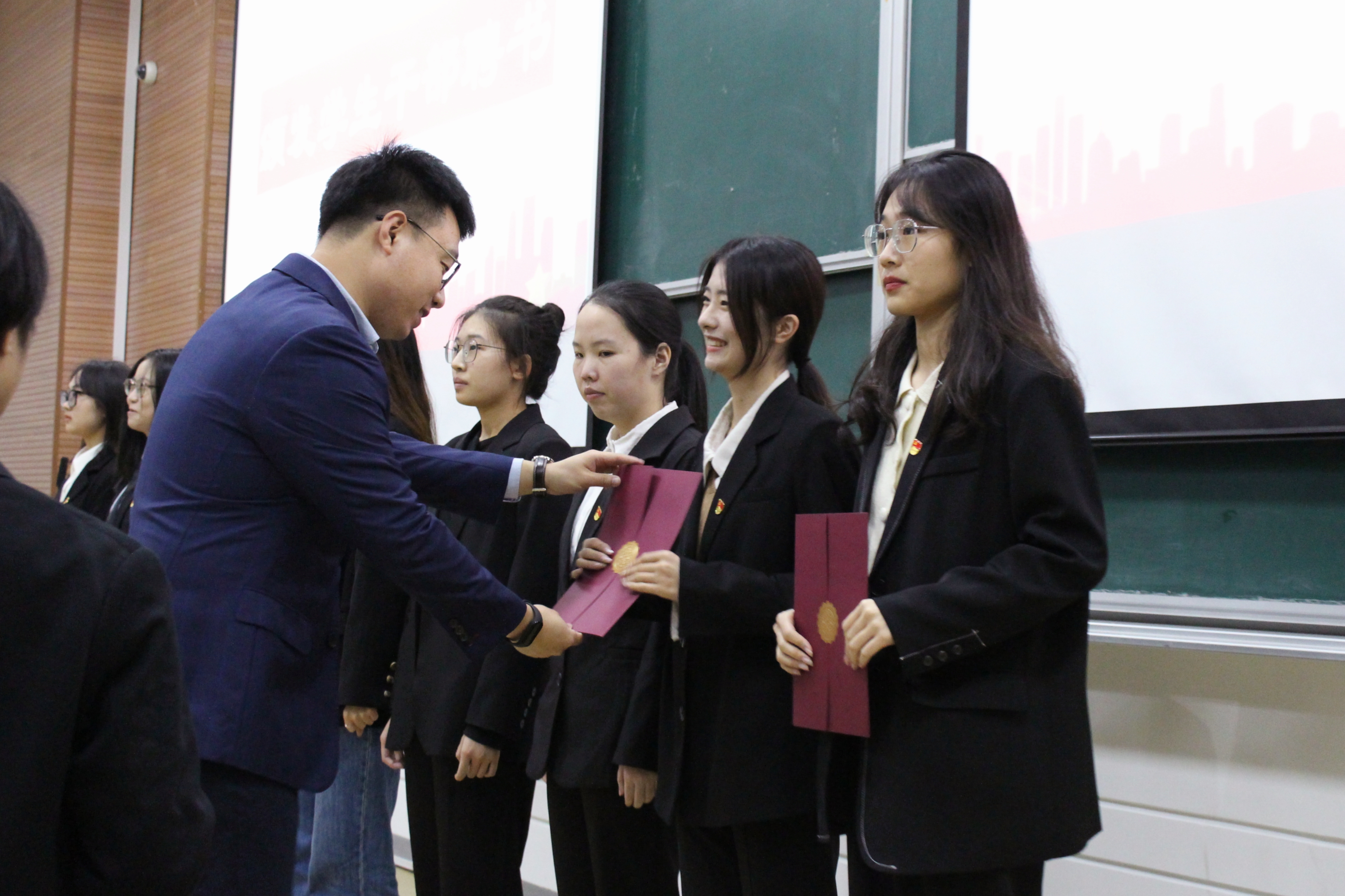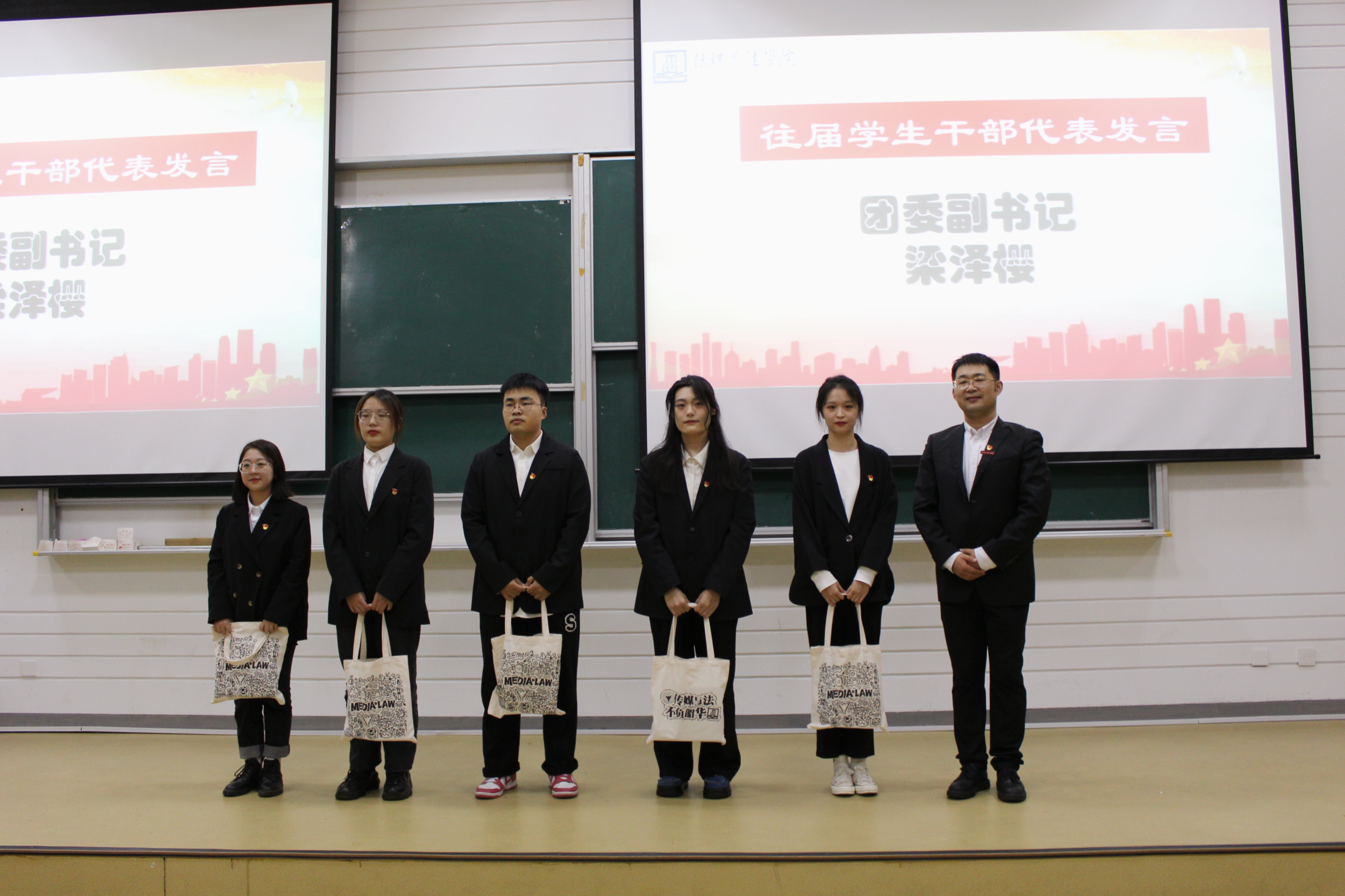 紧接着,前任团委副书记(员工)梁泽樱作为往届员工干部代表发言,她分享了自己的工作经历并传授了一些工作经验,以激励同学们不断努力,珍惜员工干部工作机会。现任员工干部代表、员工会执行主席叶涵作为代表发言,她表示新一届团学干部在继承发扬传法公司的优良传统的同时,要充分发扬奉献、友爱、互助、进步的精神,搭建新的舞台、开创新的局面,努力使公司团学工作提升到一个新的水平。现任员工干部代表,红色青年党教中心主任张程钰榕分享了自己在大学员工干部生涯中的收获,希望员工干部们能够把自己的成长发展与党的成长发展结合起来。