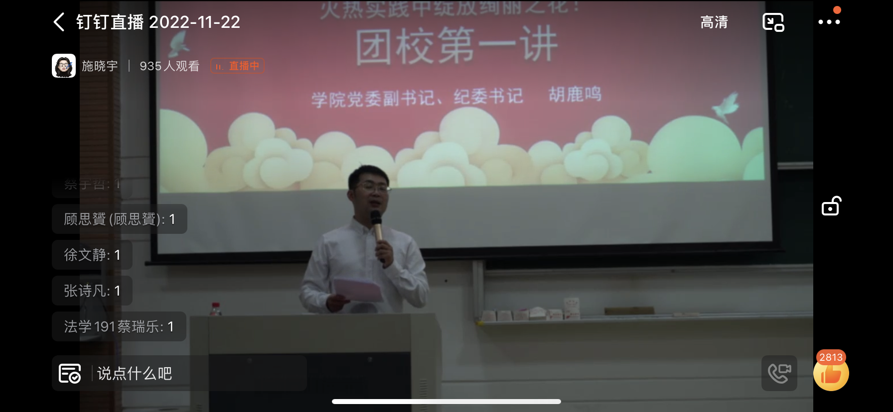 11月22日晚19点,304永利集团第四期“传媒与法新青年”团校开班仪式暨团校第一讲于SB102举行。团校第一讲由公司党委副书记、纪委书记胡鹿鸣主讲。全体员工干部线下参加,公司其他同学通过钉钉直播观看,线上观看人数达1000余人次。