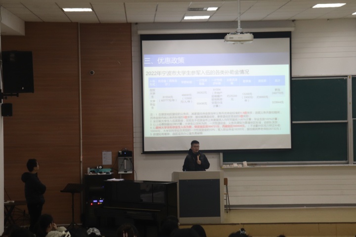 梅呈龙进行了征兵宣讲,为积极打好毕业生“征兵”主动仗,从思想上教育引导员工投身军营,提高员工参军觉悟和意识,此外,梅老师还介绍了征兵的相关政策和报名流程,对学费补贴和优待金进行了说明,并欢迎同学们向他咨询相关问题。