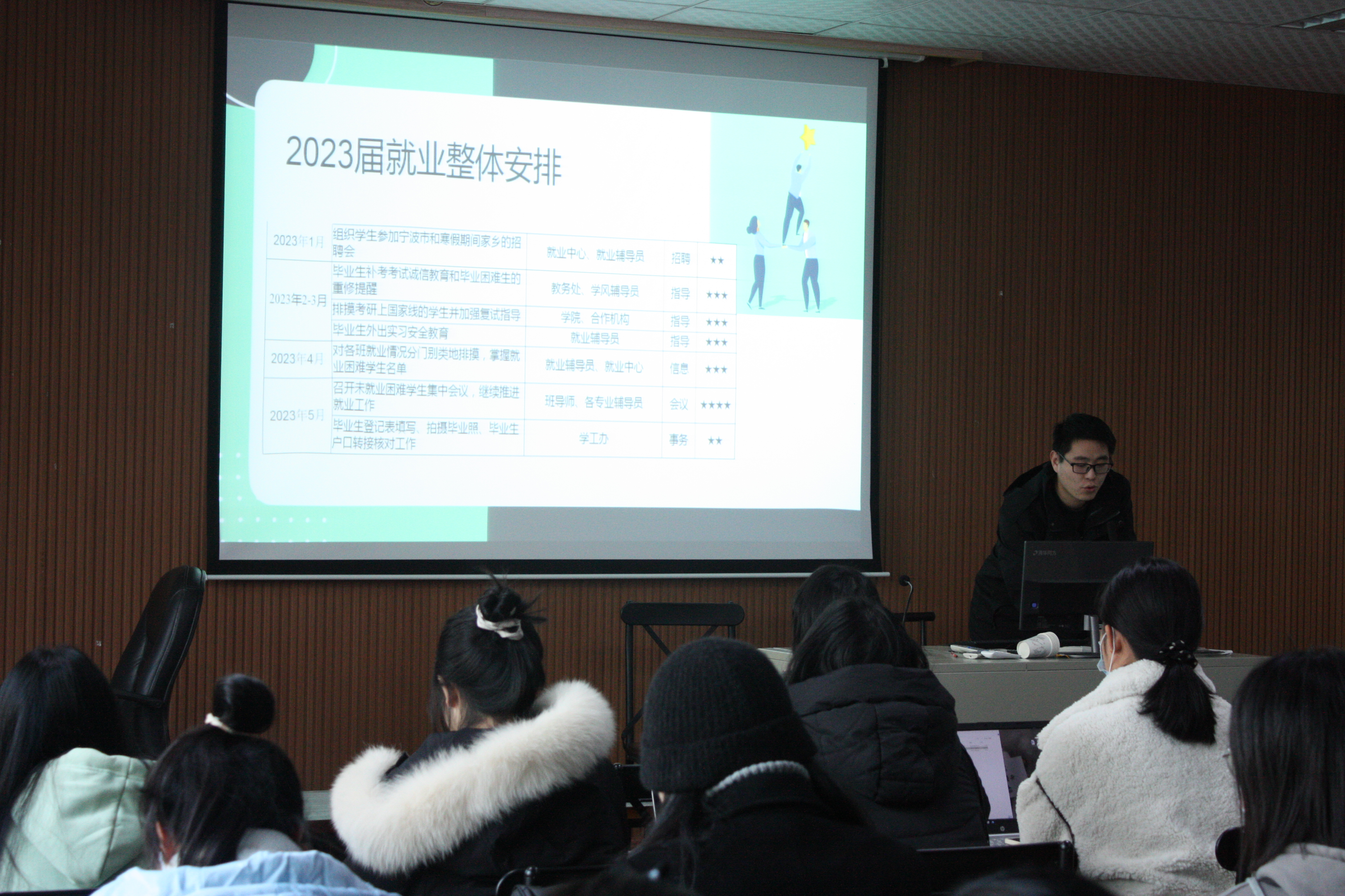 奚捷捷根据2023届就业形势,结合去年就业情况,给同学们介绍了就业相关的具体资讯,包括就业协议网签申请流程、宁波市就业政策、公司就业月安排等,使同学们的就业规划更加全面、具体。