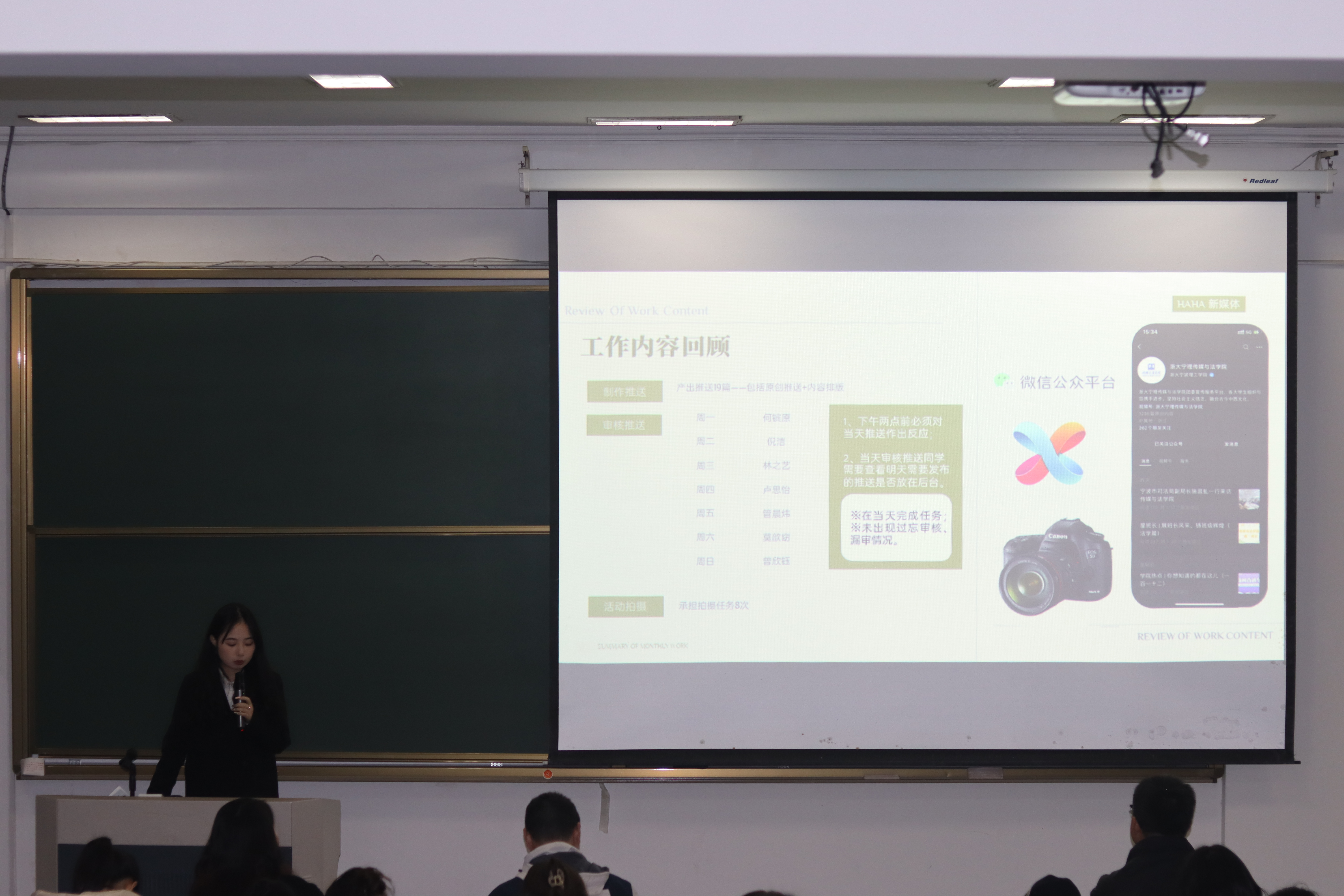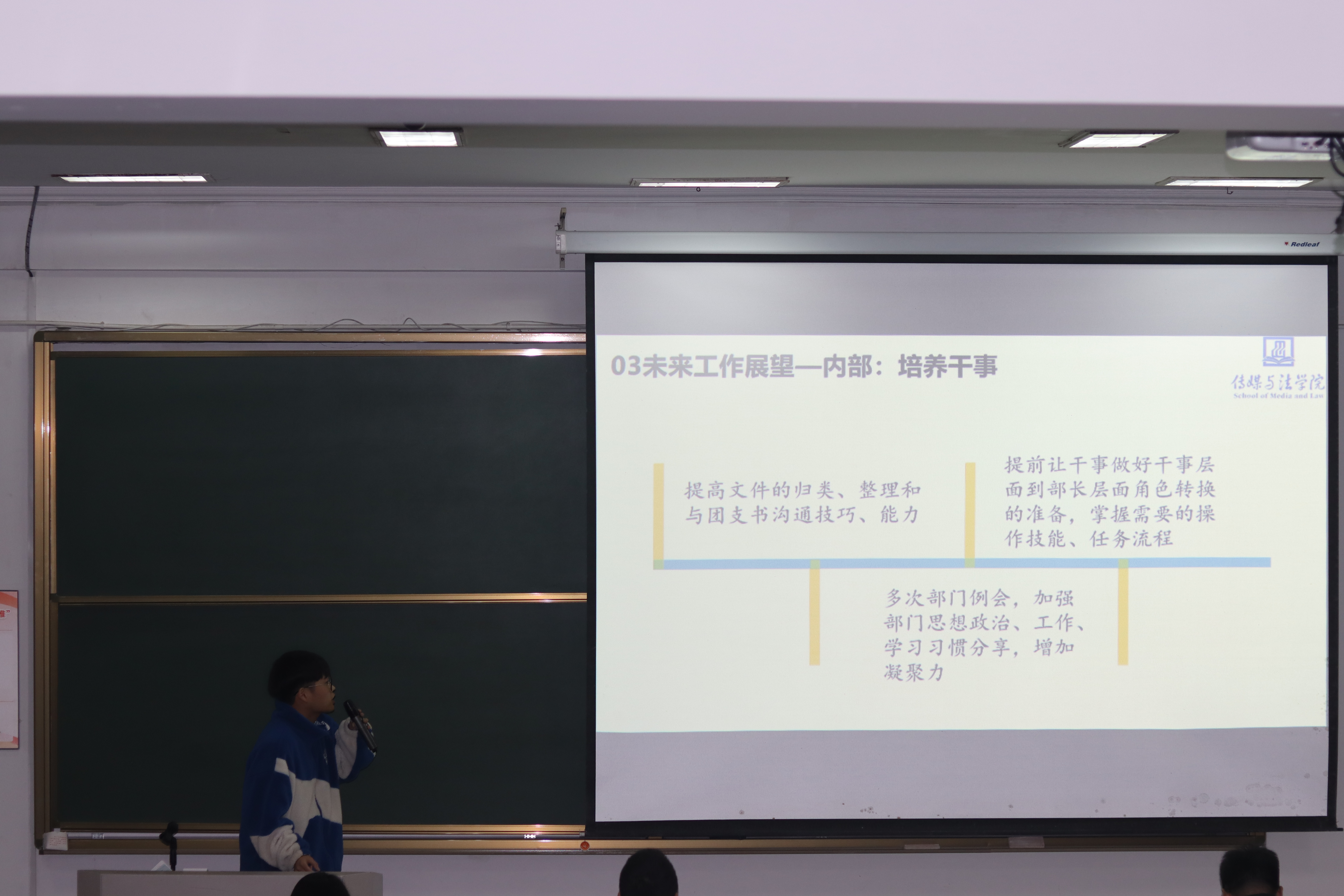 28个部门述职完毕后,胡鹿鸣对此次述职大会进行总结讲话,他对各部门的工作给予了充分肯定,并从以下三个方面给予大家建议和期望:首先,希望大家能够明确开展部门述职的目的意义所在,学会不仅要“埋头赶路”,更要“抬头看天”,以此次述职大会为契机,总结经验,相互交流学习,传承部门经验财富;其次,对各部门述职汇报情况进行点评;最后,希望同学们以“功成不必在我,功成必定有我”的担当精神积极作为,在团学工作上发扬“钉钉子精神”、“卓越精神”,牢记全心全意为员工服务的宗旨,不负青春,不负韶华。
