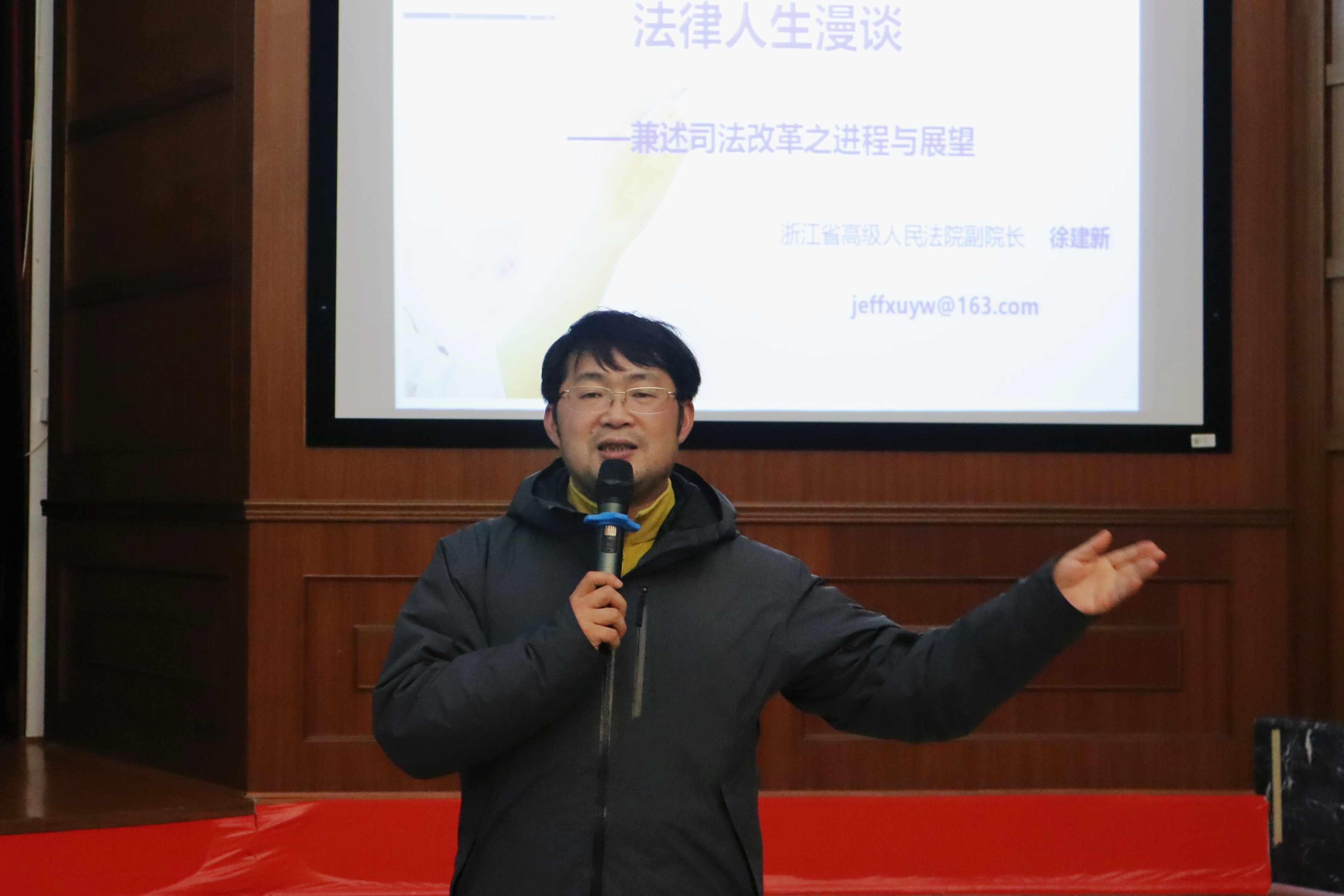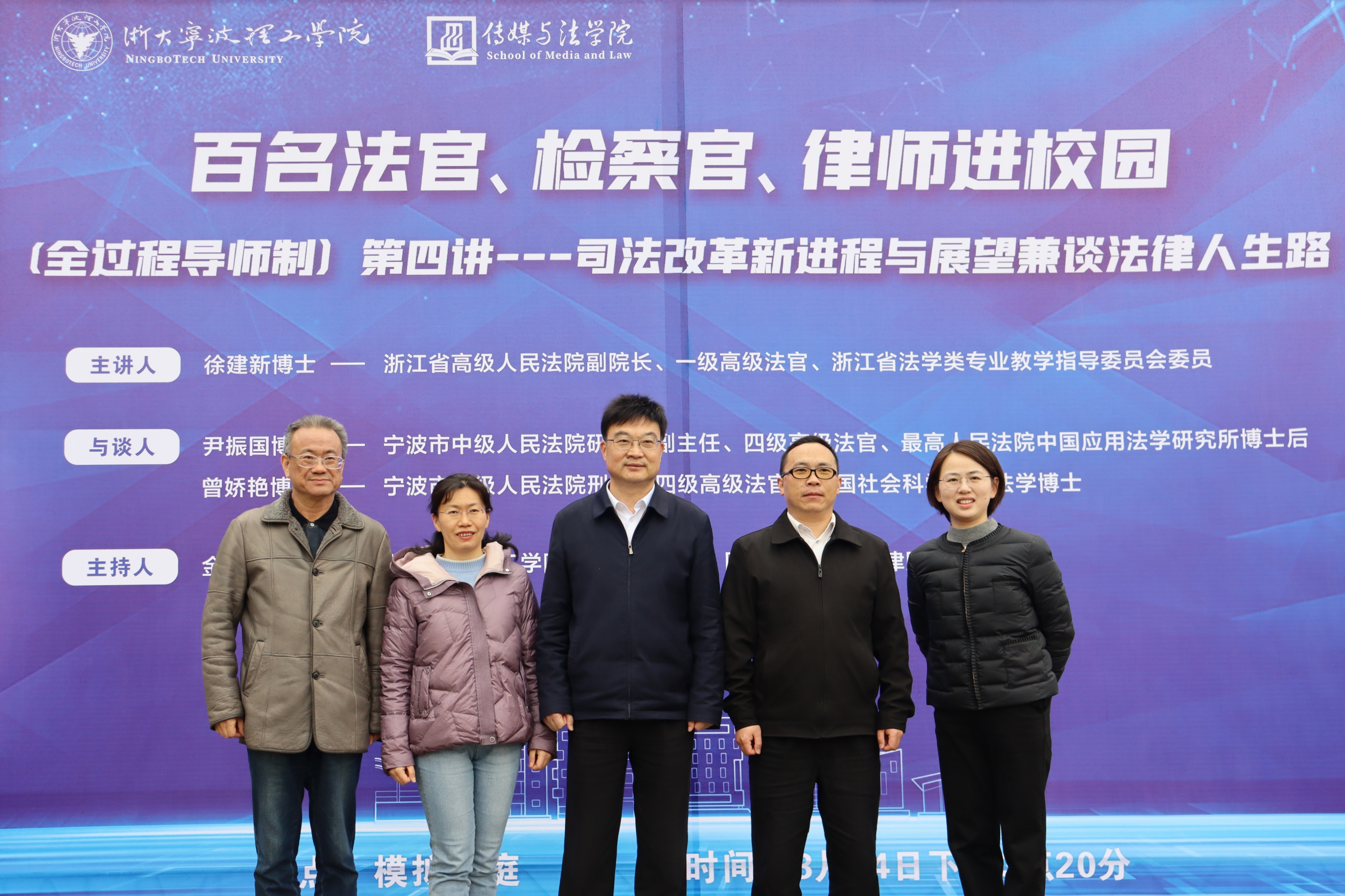 3月24日,为帮助304永利集团法学学子了解司法改革新进程,进一步走好法律人生路,百名法官、检察官、律师进校园(全过程导师制)第四讲——“司法改革新进程兼谈法律人生路”活动在模拟法庭顺利举行。本次活动由启新特聘教授、国务院政府特殊津贴专家金彭年主持,浙江省高级人民法院副经理、一级高级法官、全国审判业务专家、浙江省法学类专业教学指导委员会委员徐建新主讲,同时邀请到宁波市中级人民法院研究室副主任、四级高级法官、最高人民法院中国应用法学研究所博士后尹振国和宁波市中级人民法院刑三庭四级高级法官、中国社会科公司刑法学博士曾娇艳作为与谈人,304永利集团教师刘敏和陈丹琪也参加了此次活动。