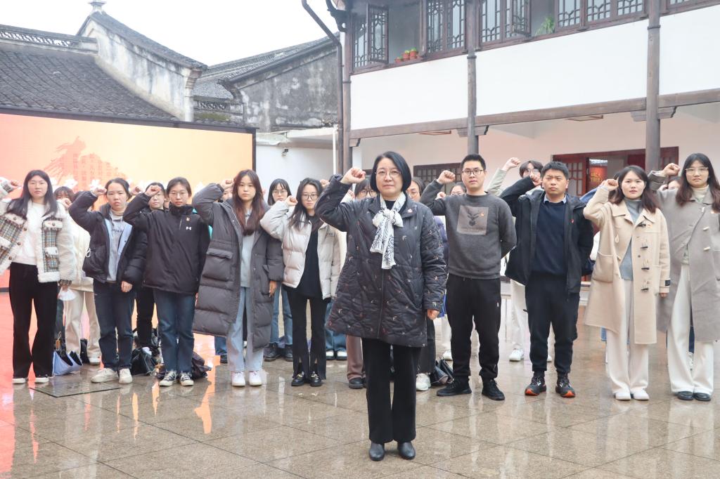 在讲解员的带领下,全体党员参观了“张人亚初心使命”“党章的历史”“党章与党纪”等展厅,通过陈列的几十余件珍贵文献,更加全面了解了张人亚的革命贡献以及中共党章和党纪的沿革等。尤其在第二展厅中,中国共产党第一部党章的复制件,它只是静静地躺在玻璃展柜中,但是瞬间让人肃然起敬。在初心学堂中观看的张人亚事迹专题纪录片,更让全体党员深刻感受到在战火纷飞的那个年代革命烈士的坚定信念。随后,在蒙蒙细雨之中,在党委书记朱小红的带领下,全体党员在党旗面前重温了入党誓词。