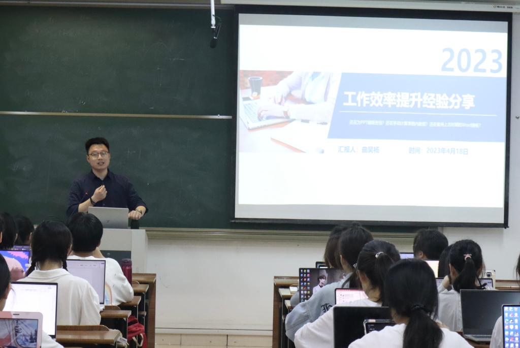曲昊杨老师首先向同学们介绍了“PPT的基本使用方法”。他向同学们着重强调了PPT的播放方式,建议同学们制作PPT的第一步就是要了解“PPT如何进行播放设置”,以免影响正常的汇报流程。曲昊杨老师又根据“PPT的美化技巧”对同学们进行了现场教学,让同学们学习到了“格式对齐”“字体统一”“视频与音频嵌入”以及“动画应用”等基础技能,为PPT的制作锦上添花。接着,曲昊杨老师通过实际操作向同学们讲解了“Excel表格的应用方法”,让同学们了解到“创建公式提取身份信息”“文本分列”等基础的数据统计方式,帮助同学们摆脱了死板的制作方式,提高了表格的统计效率。随后,曲昊杨老师结合自己的工作经历,以运用审批表为案例,为同学们进行了“Word模板的基础讲解”。