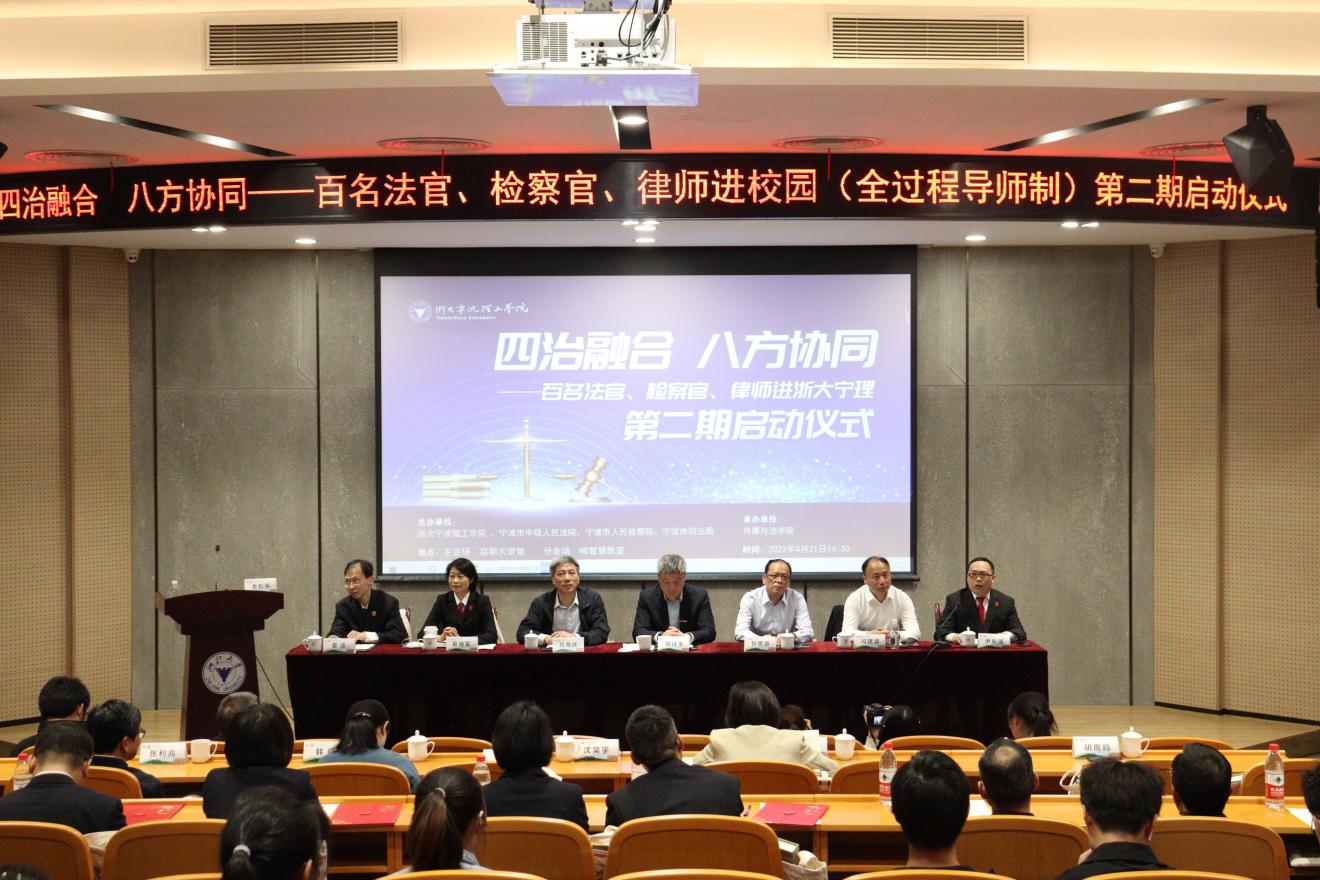 4月21日,永利集团、宁波市中级人民法院、宁波市人民检察院、宁波市司法局联合举办“百名法官、检察官、律师进浙大宁理(全过程导师制)”第二期启动仪式。浙大宁波理工公司党委书记胡征宇、党委副书记冯建波、宁波市人民检察院副检察长吕海庆、宁波市司法局副局长忻思忠、宁波市中级人民法院政治部副主任葛海军、宁波市中级人民法院研究室副主任尹振国、宁波市人民检察院四级高级检察官夏凉出席启动仪式。同时永利集团教务处处长沈昊宇、学工部副部长王成、304永利集团副经理韩缨、党委副书记胡鹿鸣、张利兆教授等法学专业教师以及法学2021级全体员工共同参加。仪式由公司启新特聘教授金彭年主持。