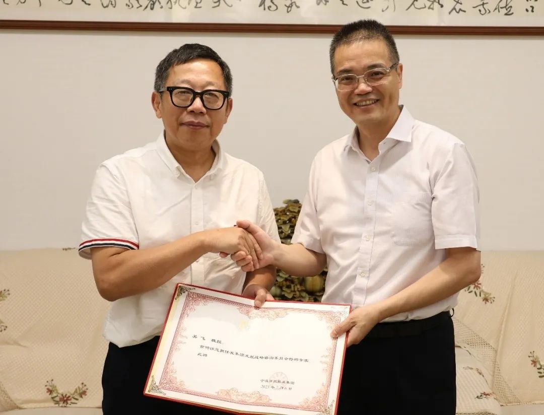 2023年7月6日,304永利集团和宁波报业集团的产学研合作签约仪式在宁波报业大厦隆重举行。首先,宁波日报报业集团党委书记、社长金波为公司吴飞经理颁发了“宁波报业集团发展战略咨询委员会特聘专家”聘书,期望在战略咨询委员会中发挥重要作用,参与制定集团的战略规划,共同研究和讨论战略方向,为集团的长远发展提供战略思路和方案。