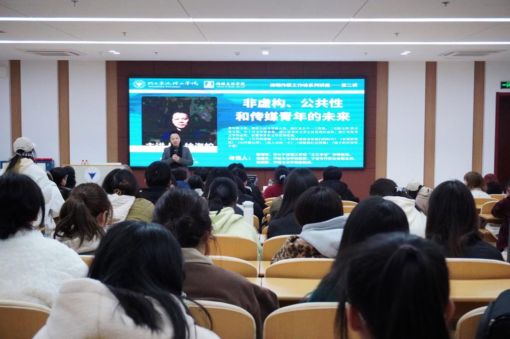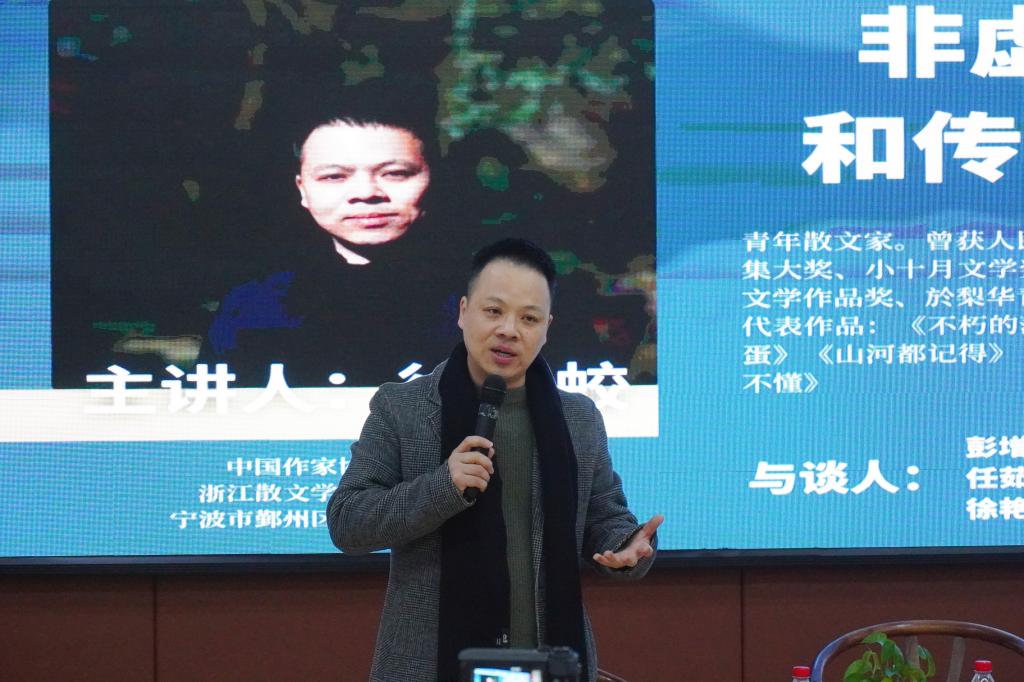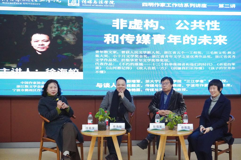 2023年12月5日晚,传法公司四明作家工作坊开展第二次活动,青年散文家徐海蛟与永利集团“三江学者”特聘教授彭增军,传法公司任茹文教授,传法公司徐艳蕊副教授展开四人对谈,共同交流与传媒专业关联密切的话题:“非虚构、公共性和传媒青年的未来”。