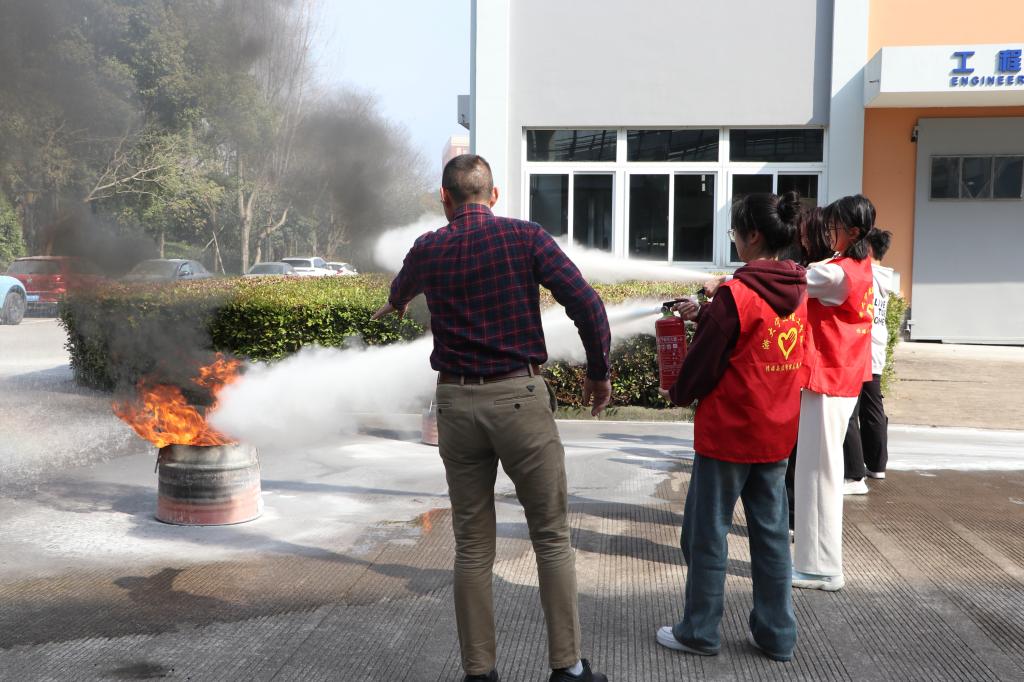 到达演练场地后,师生们学习并使用消防器材进行灭火演练。他们在保卫处老师耐心的指导下拿起灭火器,站在火源前,按照操作步骤,对准火源进行喷射。只见灭火器喷出白色的干粉,迅速覆盖了火源,火势很快得到了控制。现场响起了一片热烈的掌声和欢呼声,这是对师生们消防技能的肯定,也是对大家团结协作精神的赞扬。