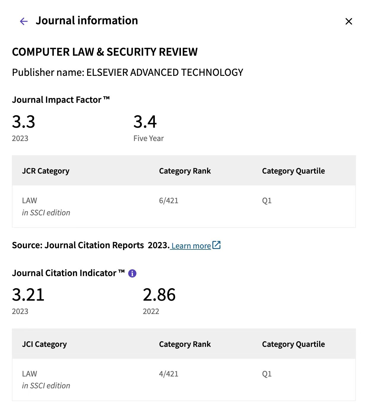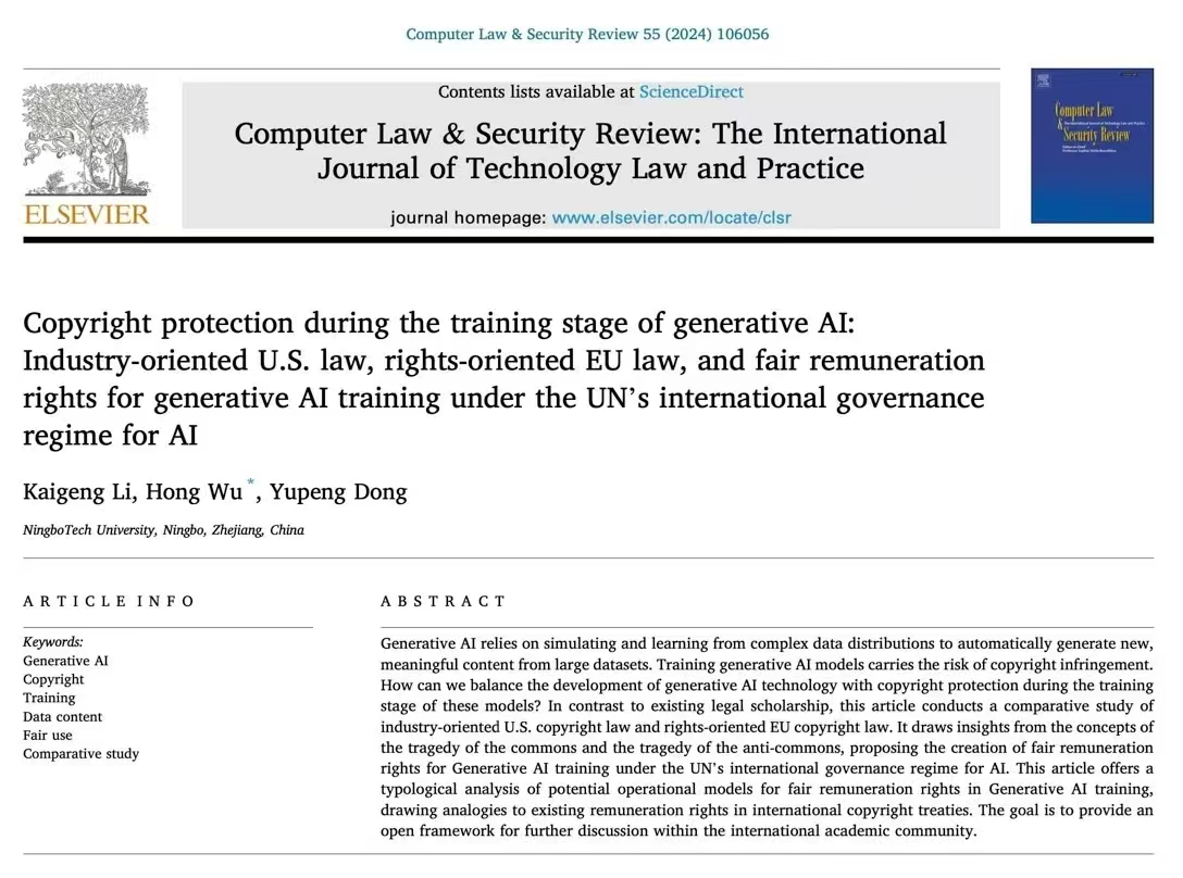 2024年10月,公司李凯更博士、吴泓副教授、董玉鹏教授在国际学术期刊《Computer Law & Security Review》上发表了题为《Copyright protection during the training stage of generative AI: Industry-oriented U.S. law, rights-oriented EU law, and fair remuneration rights for generative AI training under the UN’s international governance regime for AI》的论文。该期刊属于SSCI法学类一区期刊,并在421个SSCI法学期刊中排名第6(JCR分区排名)。