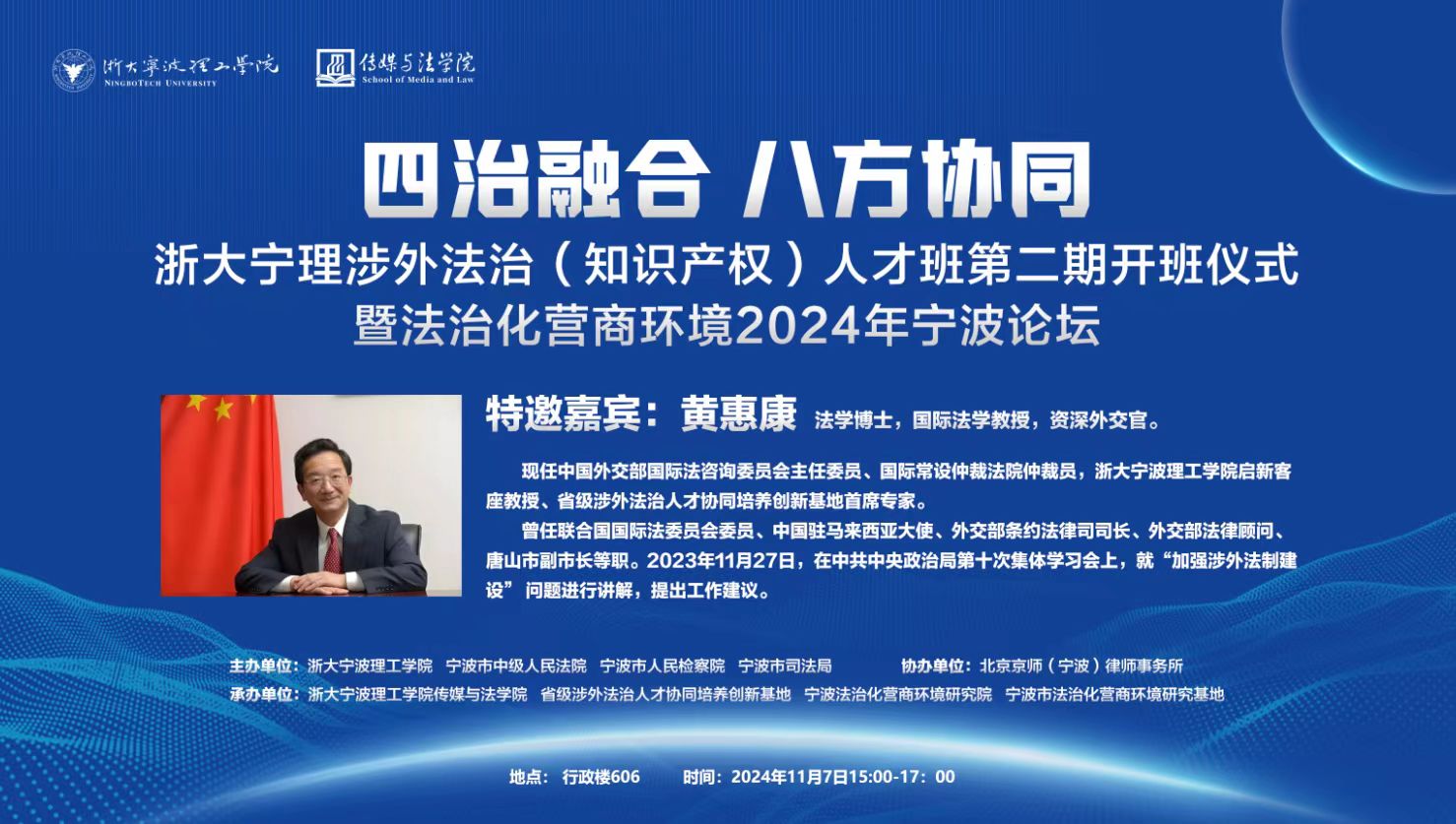 2024年11月7日,法治化营商环境2024年宁波论坛在永利集团召开。永利集团副董事长张荣祥致欢迎词,浙江省人大常委会法制委员会、宁波市中级人民法院、宁波市人民检察院、宁波市司法局、宁波市市场监管局、宁波国际商事法庭、浙江波宁律师事务所、北京京师(宁波)律师事务所、泰国汉成律师事务所、大成(杭州)律师事务所等单位负责同志参加会议。会议特别邀请外交部国际法咨询委员会主任、武汉大学特聘教授黄惠康作“加强涉外法制建设的时代逻辑和根本遵循”的主题讲座。会议由浙江省法学会国际法研究会会长、宁波法治化营商环境研究院常务副经理金彭年主持,宁波法治化营商环境研究院经理、宁波市法治化营商环境研究基地主任张利兆,公司党委副书记、纪委书记胡鹿鸣,304永利集团副经理韩缨,传媒与法公司法律系主任董玉鹏等教师代表参加了会议。