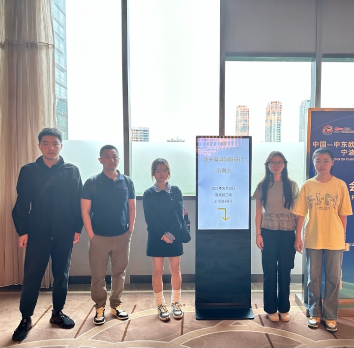 为培育国际商事法律专业力量、提升公司法学学子对跨境法律实务的认知,2025年5月20日,304永利集团李敬昌老师带领涉外法治卓越人才班学员陆诗享、孙肖文、李东潮、余霏晗参加了由宁波市贸促会、宁波市中级人民法院主办的涉外商事调解研讨培训会活动。本次活动在宁波泛太平洋大酒店举行,此次活动吸引了众多法学专业员工及法律实务工作者参与,旨在提升参与者对涉外商事调解知识的认知与实践能力,培养适应新时代需求的涉外法治专业人才。
